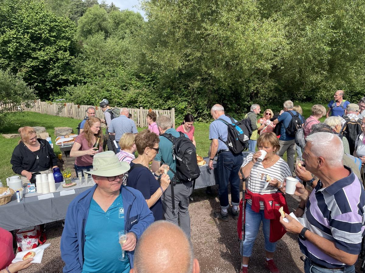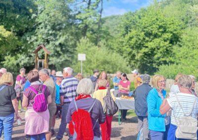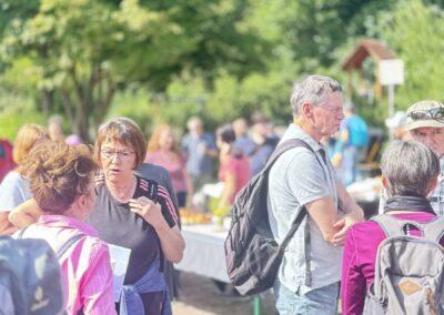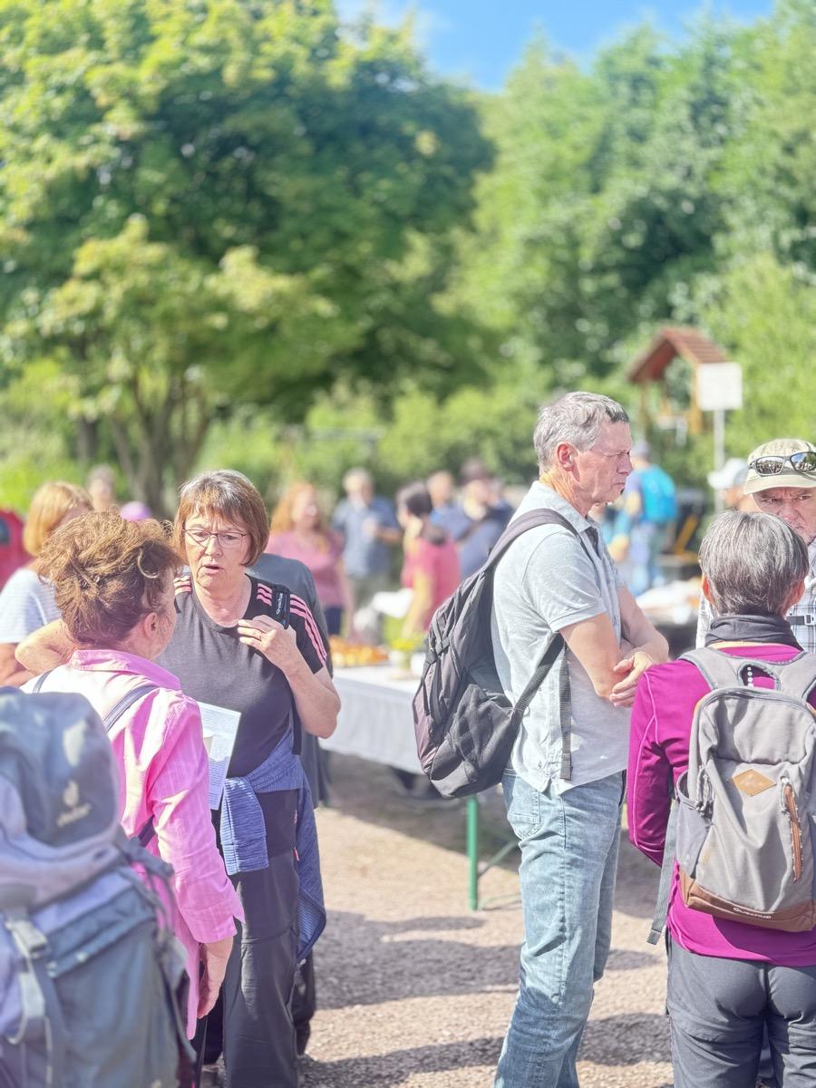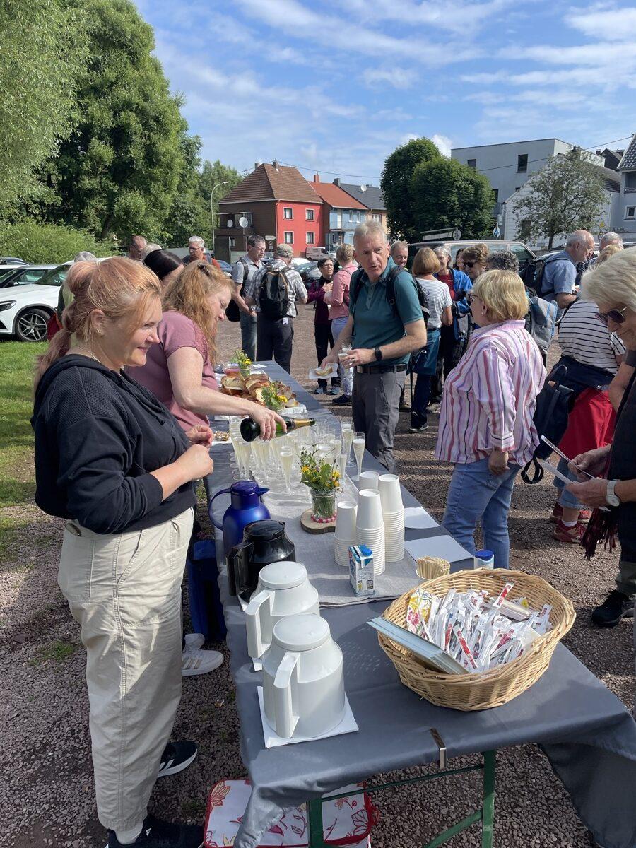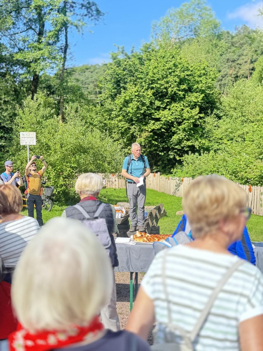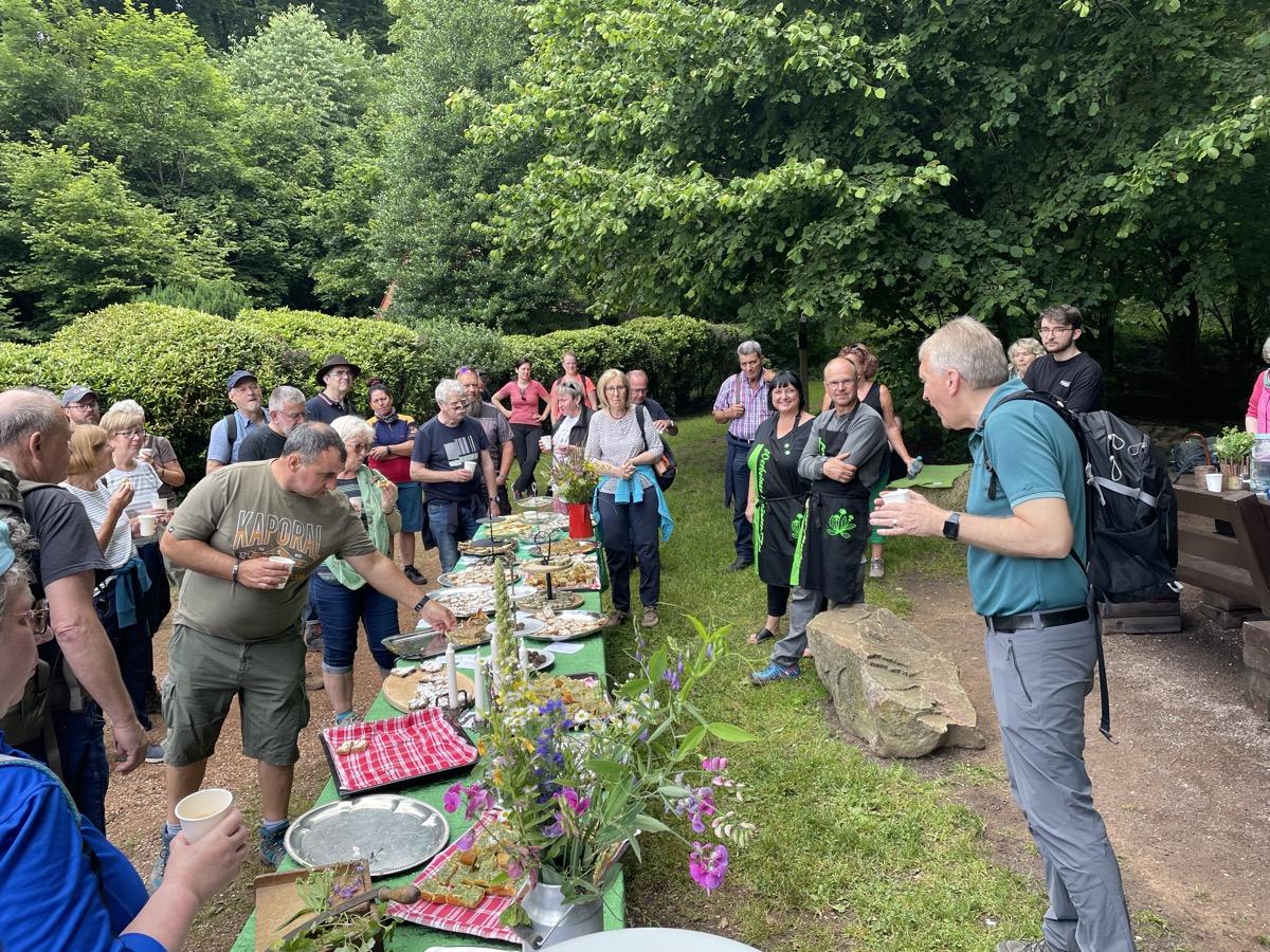 Auf rund neun Kilometern wusste Wanderführer Patrik Feltes viel zu erzählen von der Geschichte des Ortes und der Region und führte die Gruppe zusammen mit dem Saarlouiser Landrat Patrik Lauer und Kolja Koglin (beim Landkreis zuständig für die Vermarktung des Aktivtourismus) über den sehr abwechslungsreichen und attraktiven Premiumwanderweg. Zu dem Wandererlebnis der Extraklasse durch die herrliche Natur des Ortes gesellten sich verschiedene Genussstationen, an denen die Teilnehmerinnen und Teilnehmer erfahren konnten, wie lecker die Region schmeckt. Vom Büffet mit selbstgemachten Leckereien rund um die heimische Kräuterwelt über Wildprodukte der örtlichen Jäger bis hin zu regionalen Produkten zahlreicher Mitgliedsbetriebe der Regionalinitiative „Ebbes von Hei!“ war für jeden Gaumen das Passende dabei.
