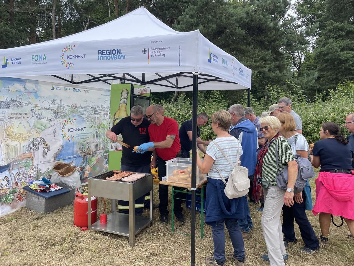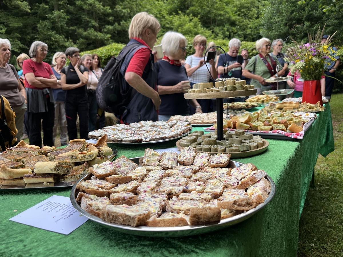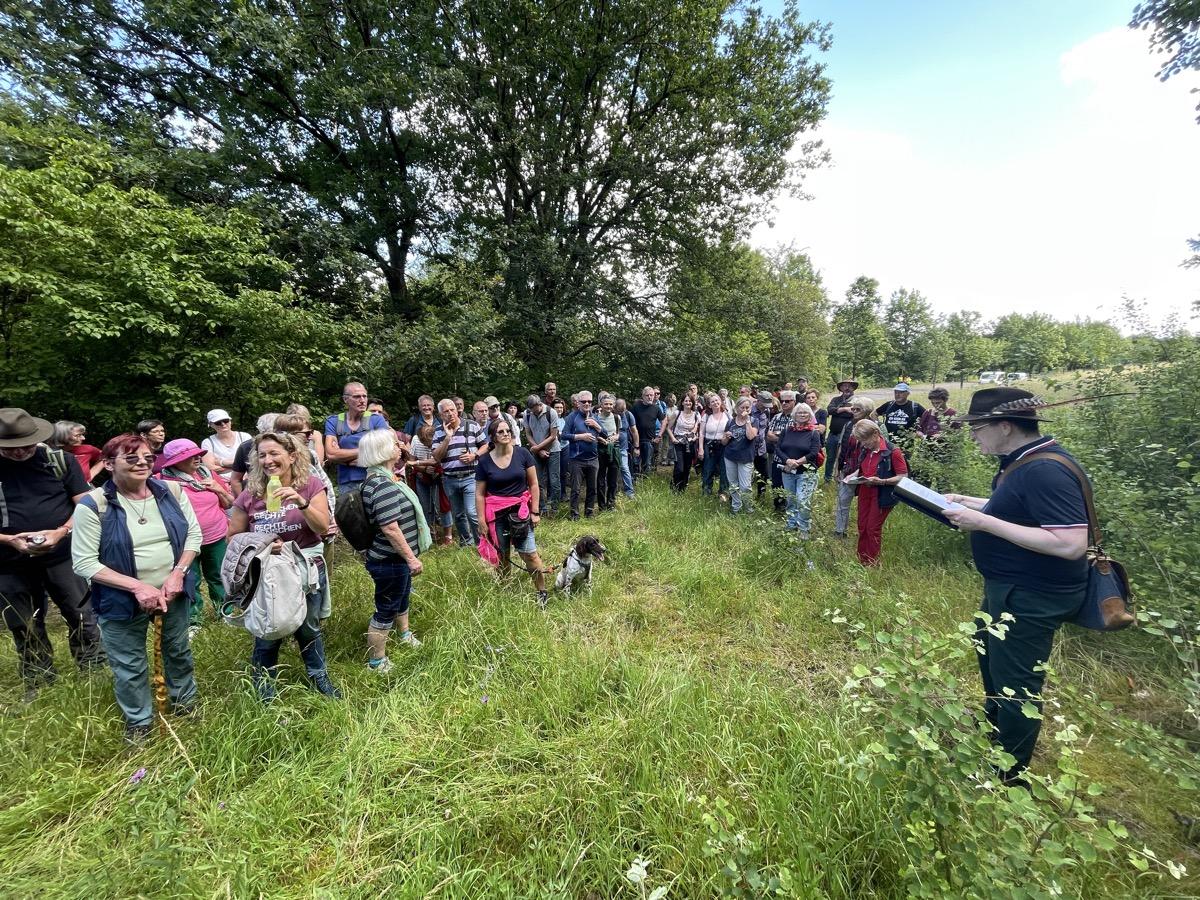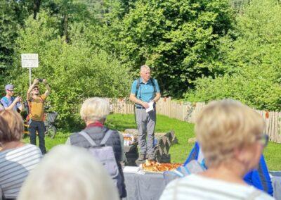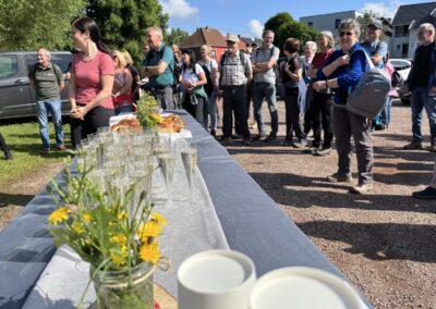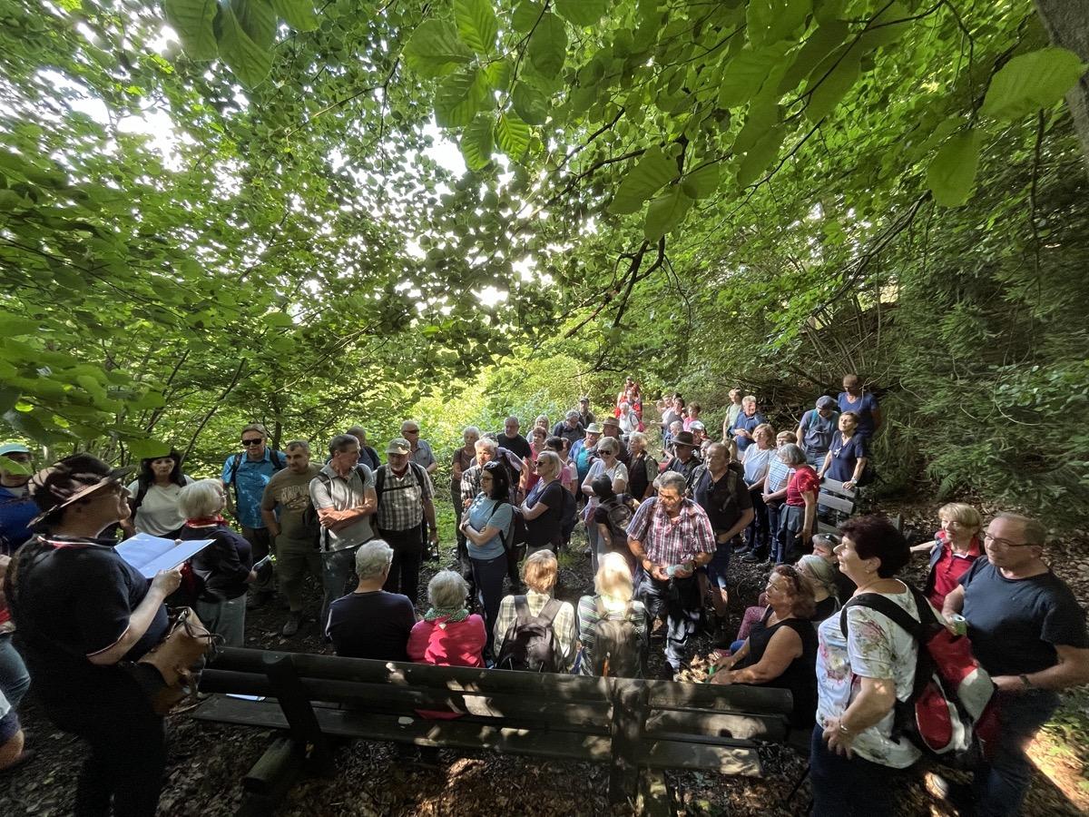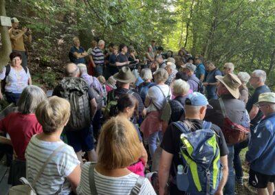 Auf rund neun Kilometern wusste Wanderführer Patrik Feltes viel zu erzählen von der Geschichte des Ortes und der Region und führte die Gruppe zusammen mit dem Saarlouiser Landrat Patrik Lauer und Kolja Koglin (beim Landkreis zuständig für die Vermarktung des Aktivtourismus) über den sehr abwechslungsreichen und attraktiven Premiumwanderweg. Zu dem Wandererlebnis der Extraklasse durch die herrliche Natur des Ortes gesellten sich verschiedene Genussstationen, an denen die Teilnehmerinnen und Teilnehmer erfahren konnten, wie lecker die Region schmeckt. Vom Büffet mit selbstgemachten Leckereien rund um die heimische Kräuterwelt über Wildprodukte der örtlichen Jäger bis hin zu regionalen Produkten zahlreicher Mitgliedsbetriebe der Regionalinitiative „Ebbes von Hei!“ war für jeden Gaumen das Passende dabei.