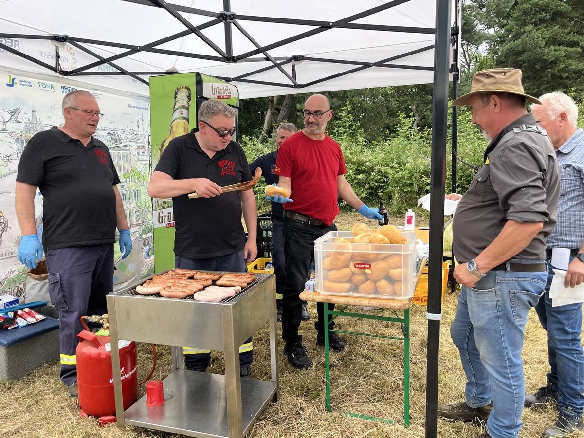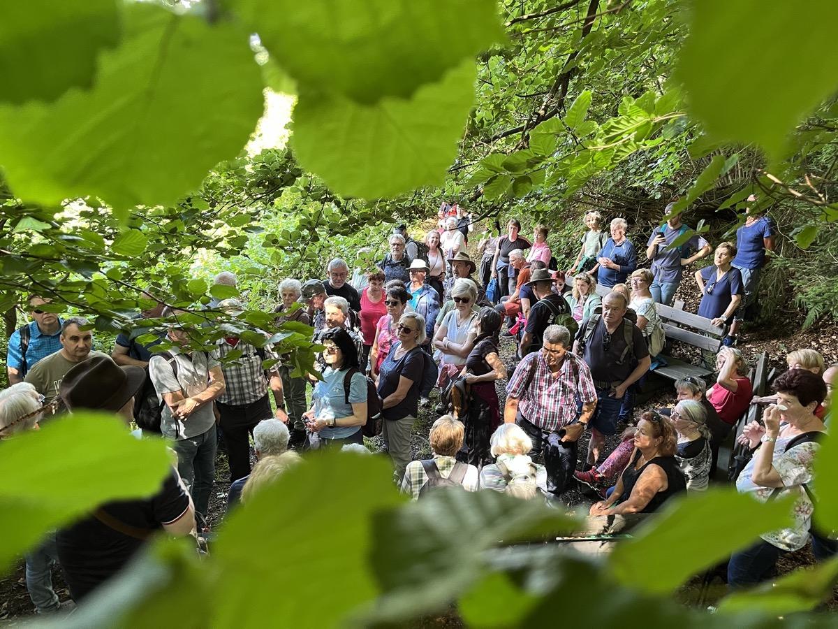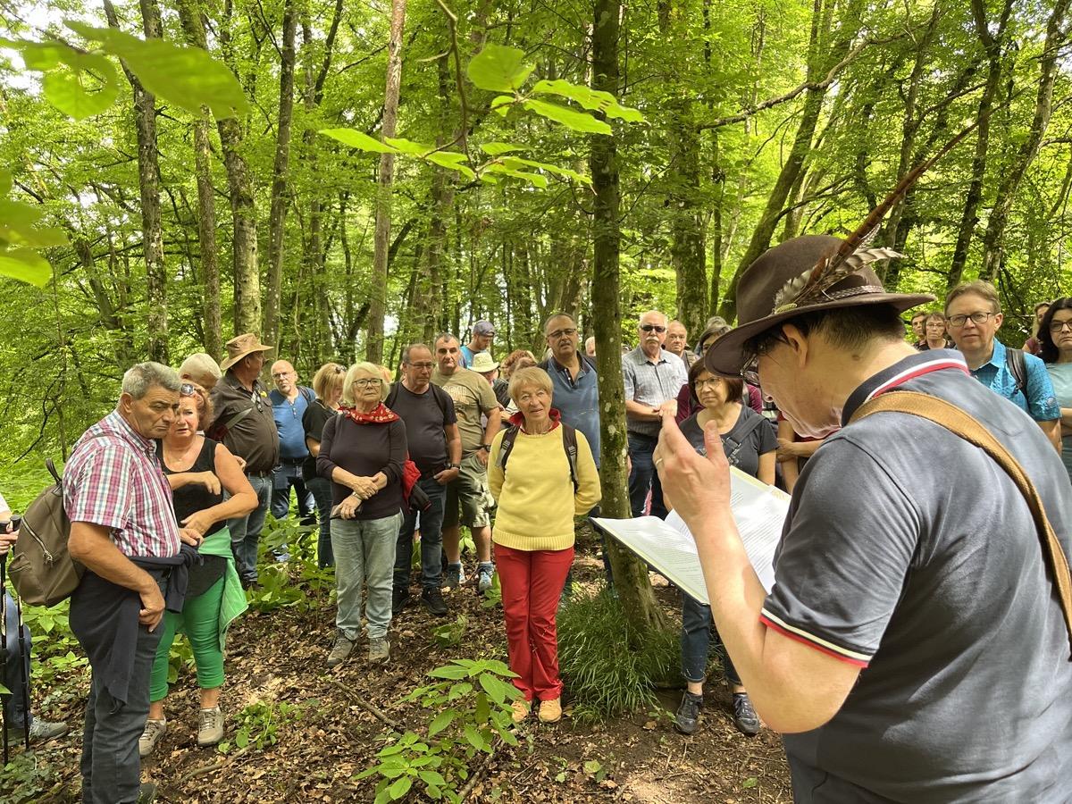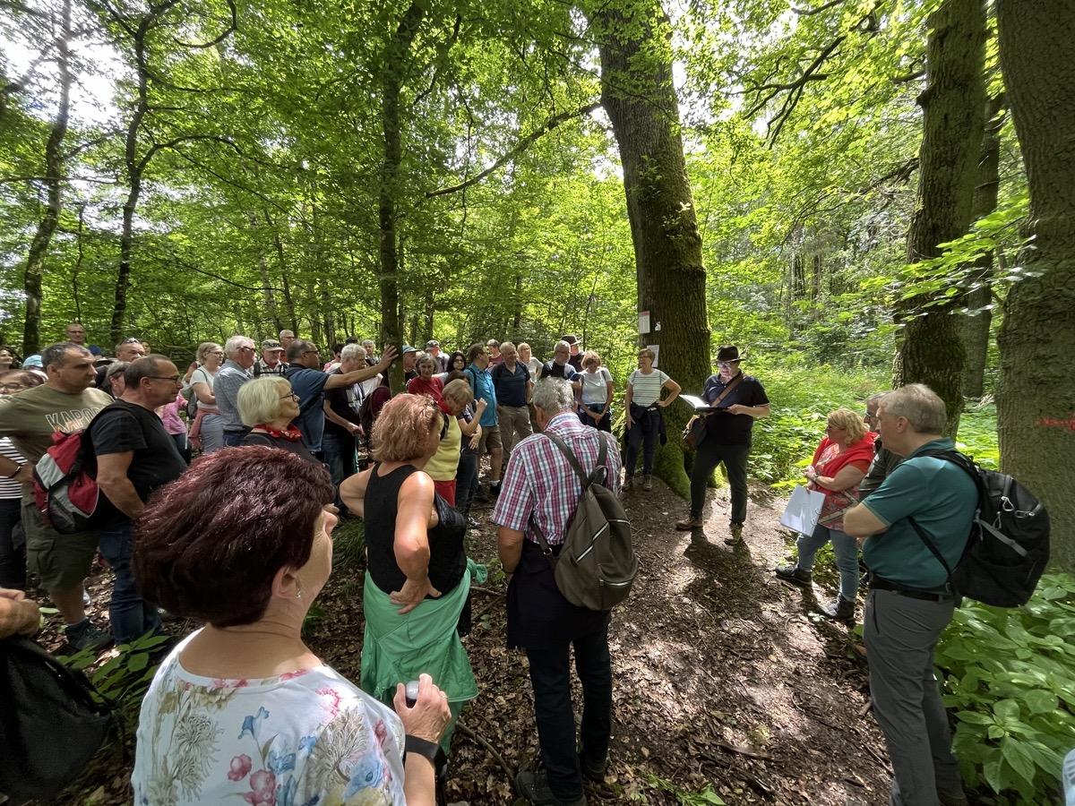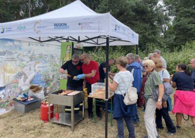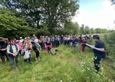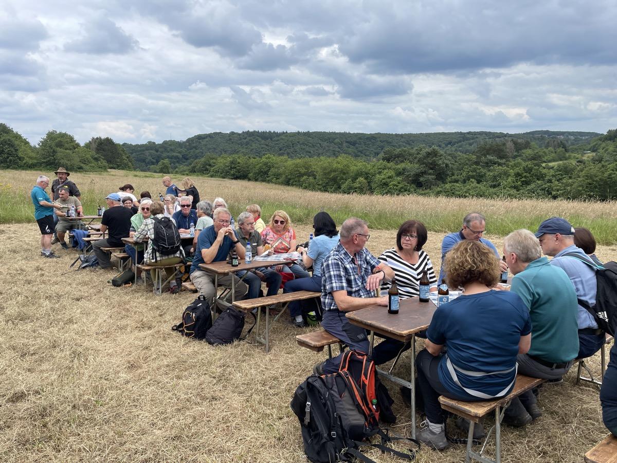 Auf rund neun Kilometern wusste Wanderführer Patrik Feltes viel zu erzählen von der Geschichte des Ortes und der Region und führte die Gruppe zusammen mit dem Saarlouiser Landrat Patrik Lauer und Kolja Koglin (beim Landkreis zuständig für die Vermarktung des Aktivtourismus) über den sehr abwechslungsreichen und attraktiven Premiumwanderweg. Zu dem Wandererlebnis der Extraklasse durch die herrliche Natur des Ortes gesellten sich verschiedene Genussstationen, an denen die Teilnehmerinnen und Teilnehmer erfahren konnten, wie lecker die Region schmeckt. Vom Büffet mit selbstgemachten Leckereien rund um die heimische Kräuterwelt über Wildprodukte der örtlichen Jäger bis hin zu regionalen Produkten zahlreicher Mitgliedsbetriebe der Regionalinitiative „Ebbes von Hei!“ war für jeden Gaumen das Passende dabei.