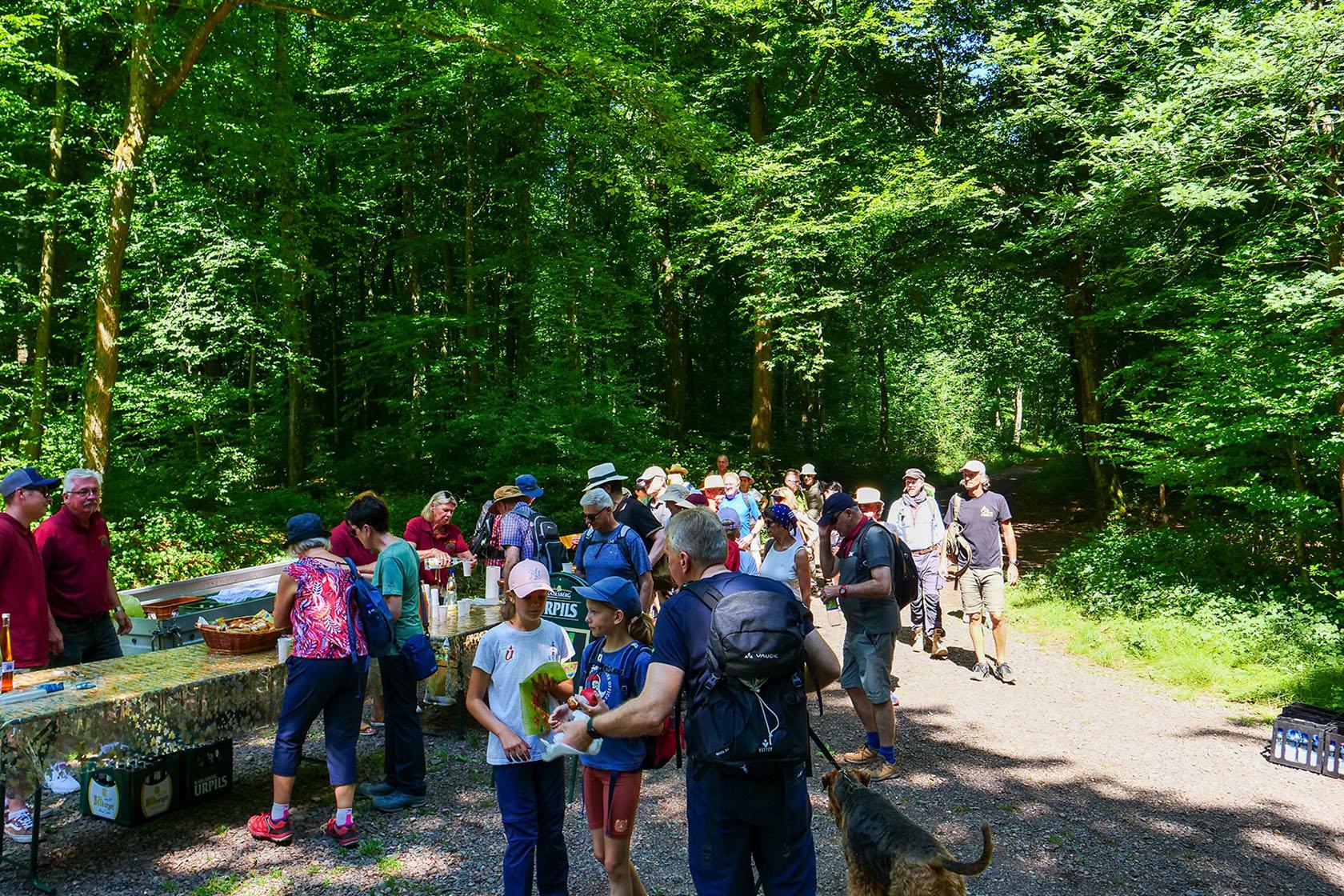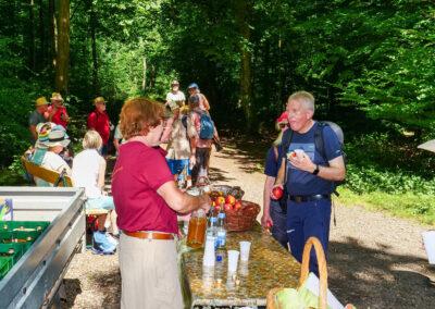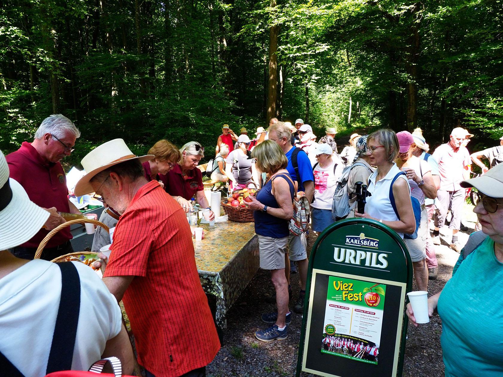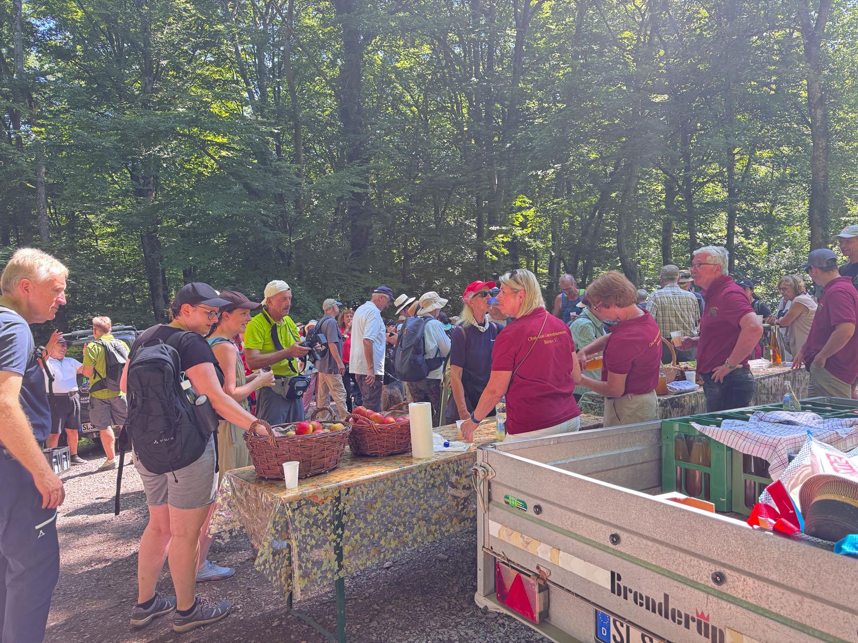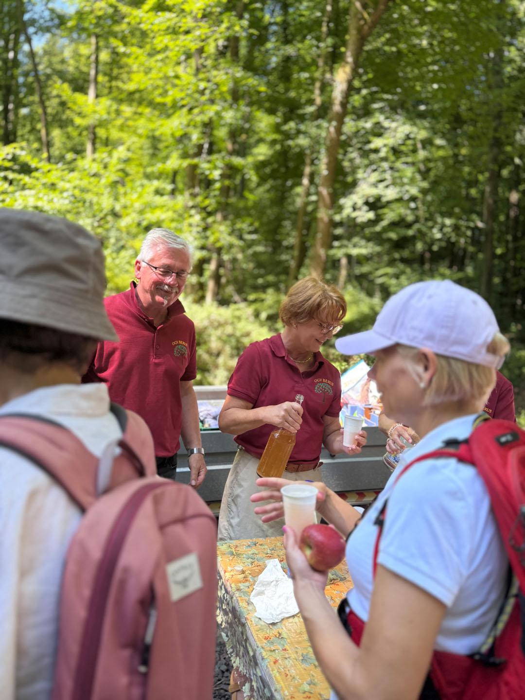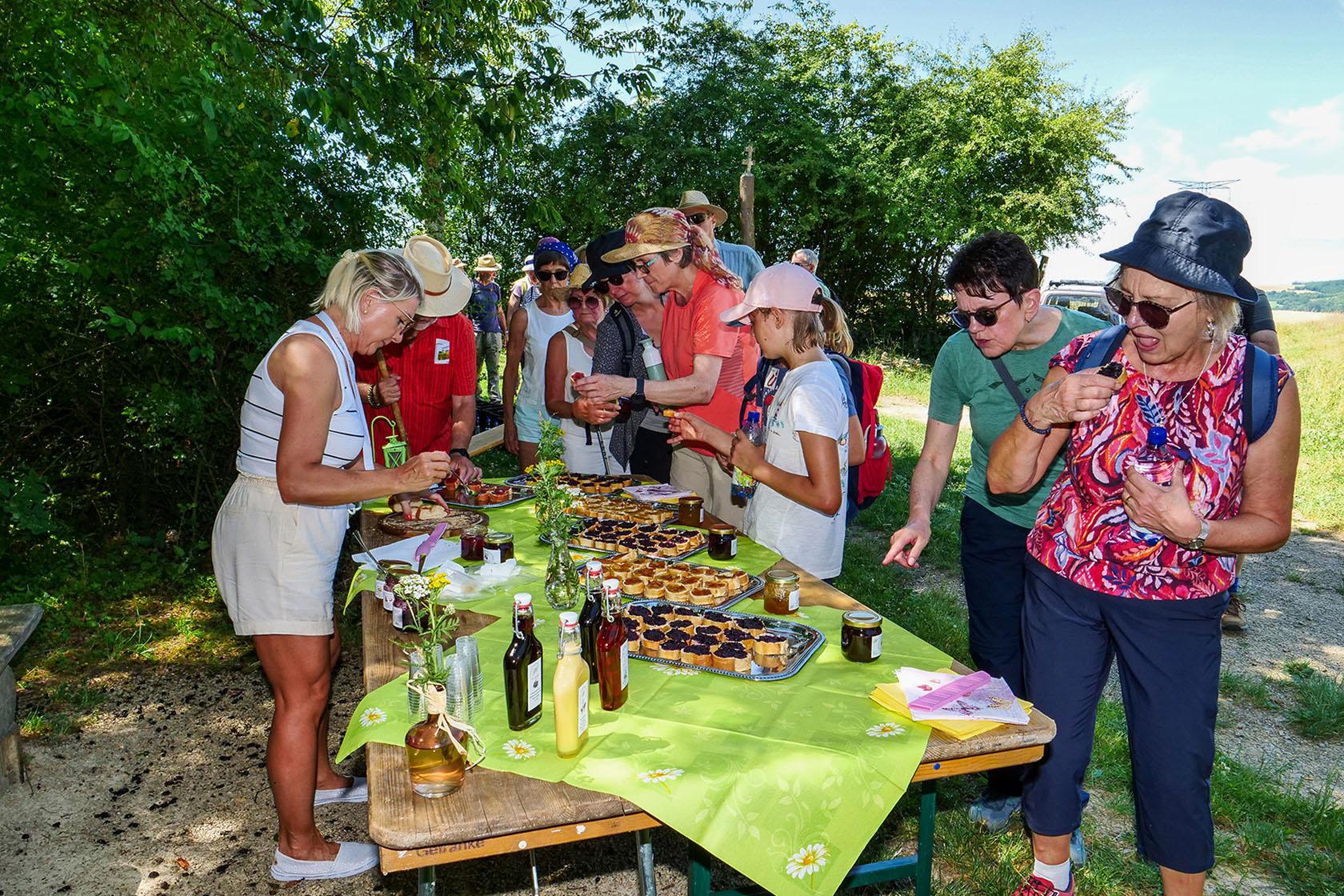 Nach dem Kaffee-Start am Europadenkmal – mit feinen Röstungen von Café Plaisir und hausgemachtem Marmorkuchen des Maison Creativ – lenkte Wanderführer Patrik Feltes die Gruppe zum Kalksteinbruch, wo Werner Fritz die Geschichte des Bergbaus und Schmugglergeschichten lebendig werden ließ. Am Waldkreuz lud der Obst- und Gartenbauverein Berus zu Viez, frischem Apfelsaft, knackigen Äpfeln und herzhaften Häppchen, ehe Paulina am Lothringer Kreuz ihre Quitten-, Mirabellen- und Kräuterliköre samt ofenfrischem Baguette präsentierte.