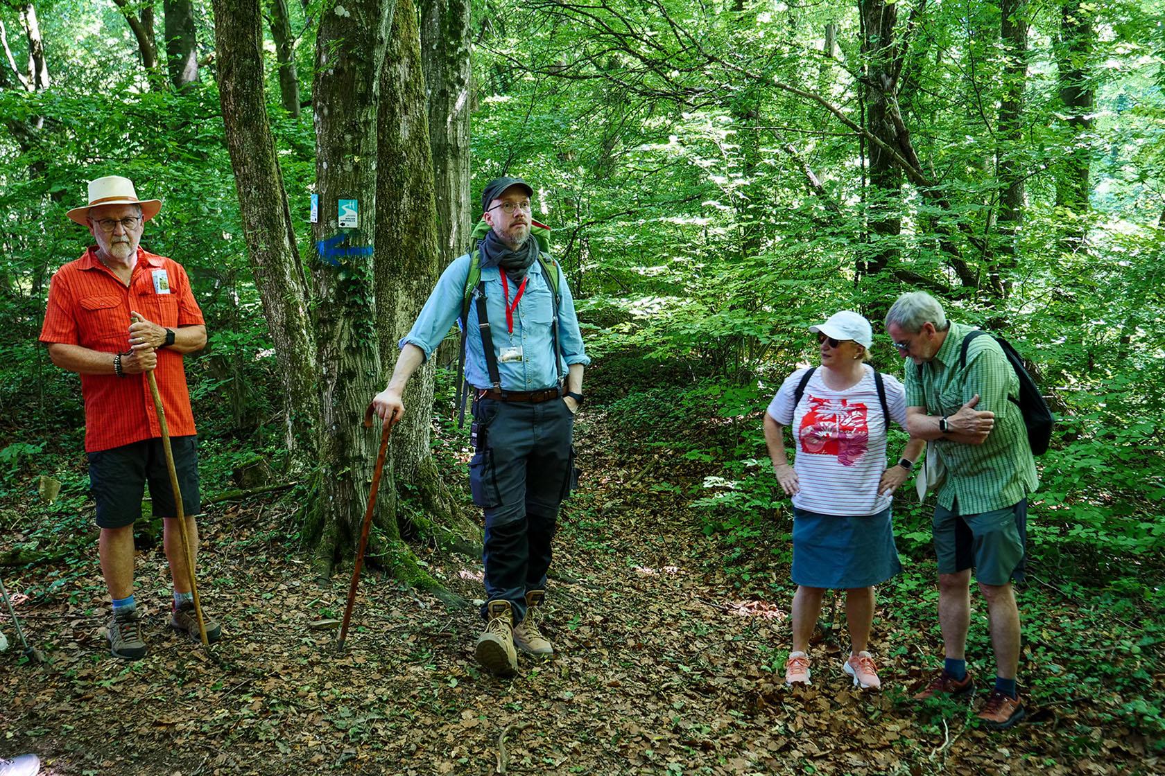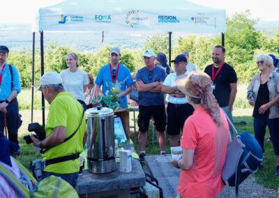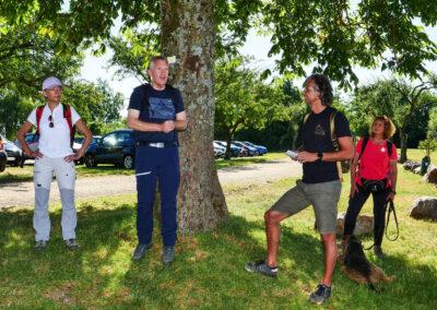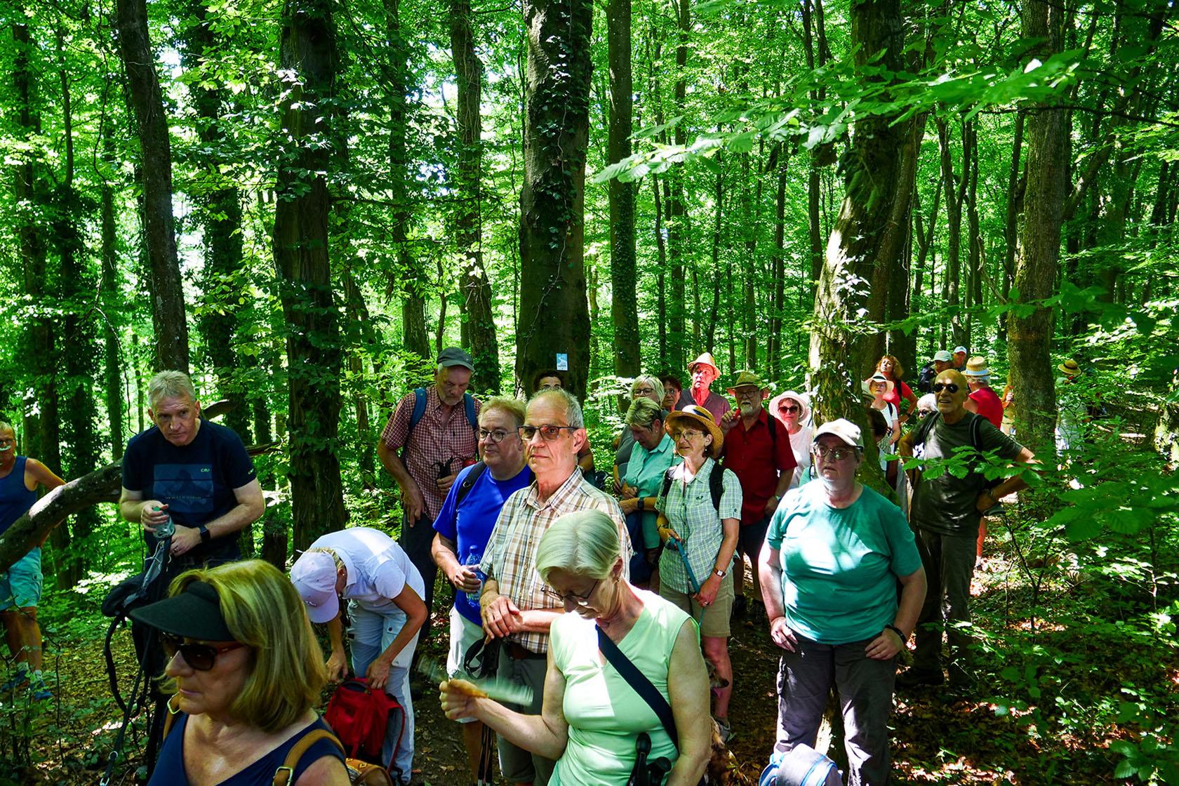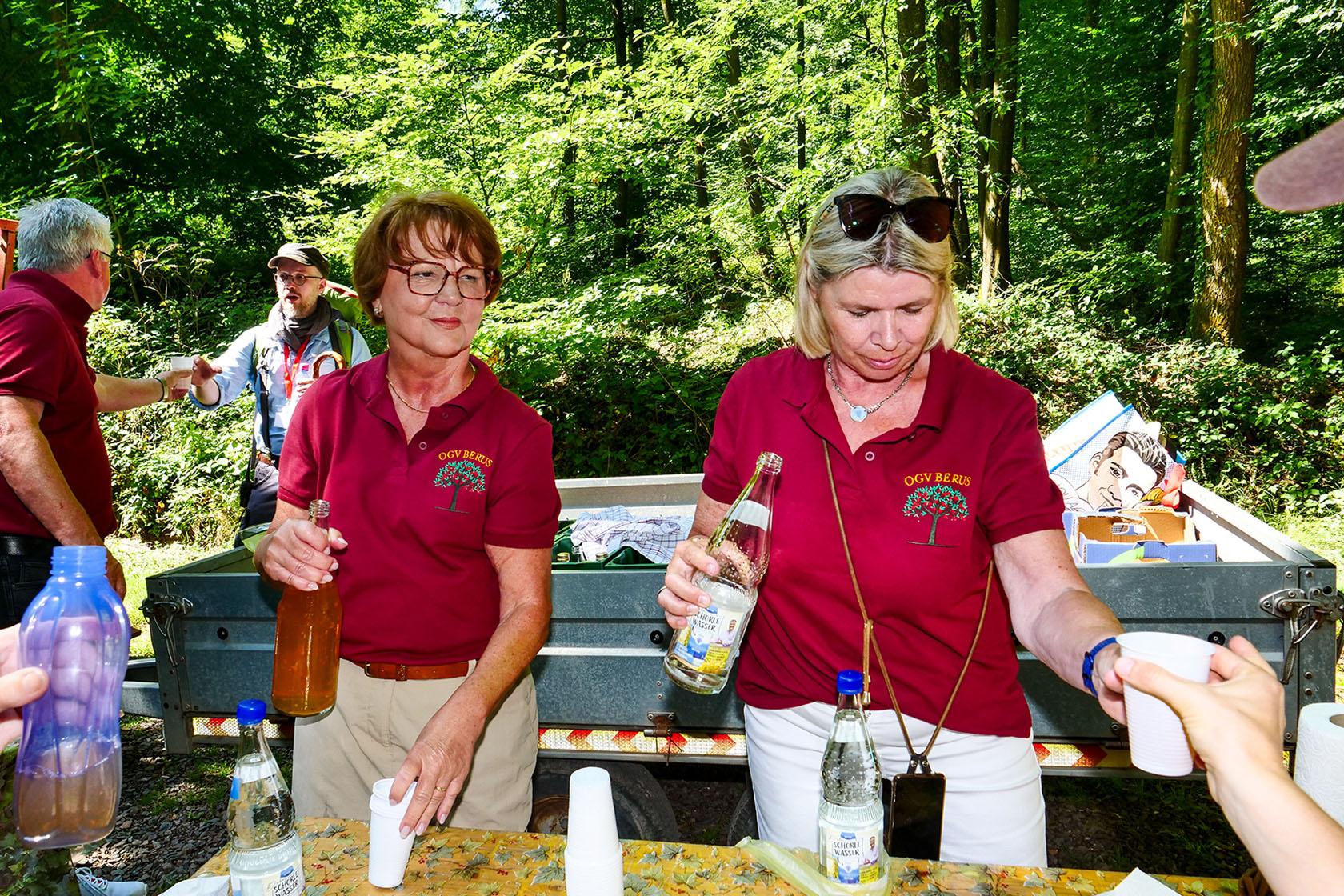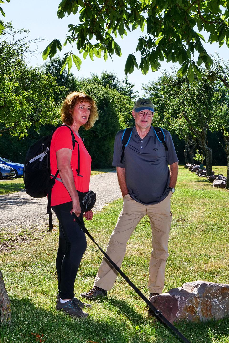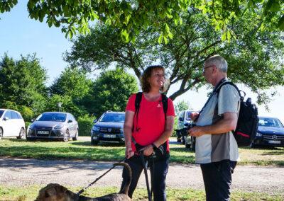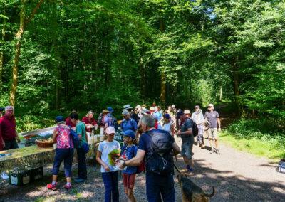 Nach dem Kaffee-Start am Europadenkmal – mit feinen Röstungen von Café Plaisir und hausgemachtem Marmorkuchen des Maison Creativ – lenkte Wanderführer Patrik Feltes die Gruppe zum Kalksteinbruch, wo Werner Fritz die Geschichte des Bergbaus und Schmugglergeschichten lebendig werden ließ. Am Waldkreuz lud der Obst- und Gartenbauverein Berus zu Viez, frischem Apfelsaft, knackigen Äpfeln und herzhaften Häppchen, ehe Paulina am Lothringer Kreuz ihre Quitten-, Mirabellen- und Kräuterliköre samt ofenfrischem Baguette präsentierte.