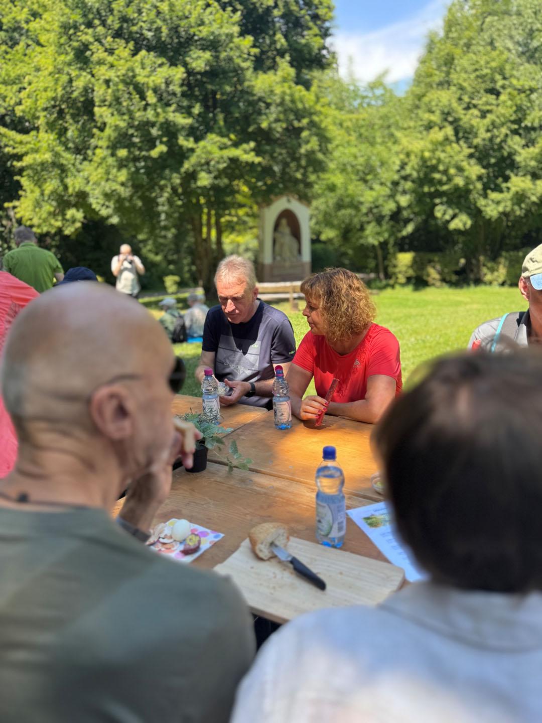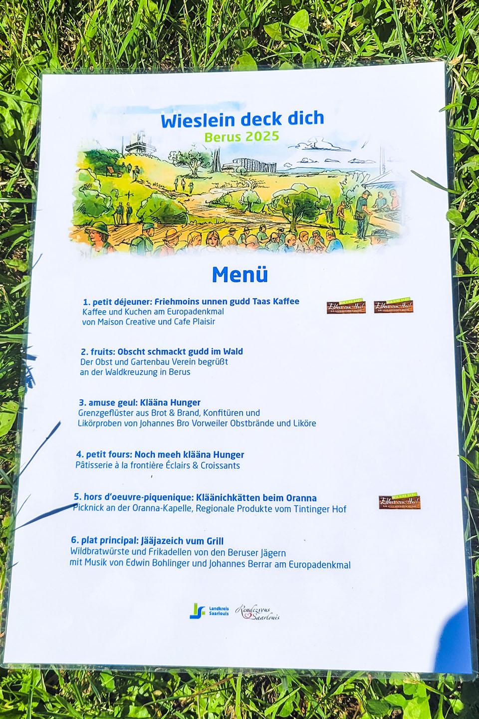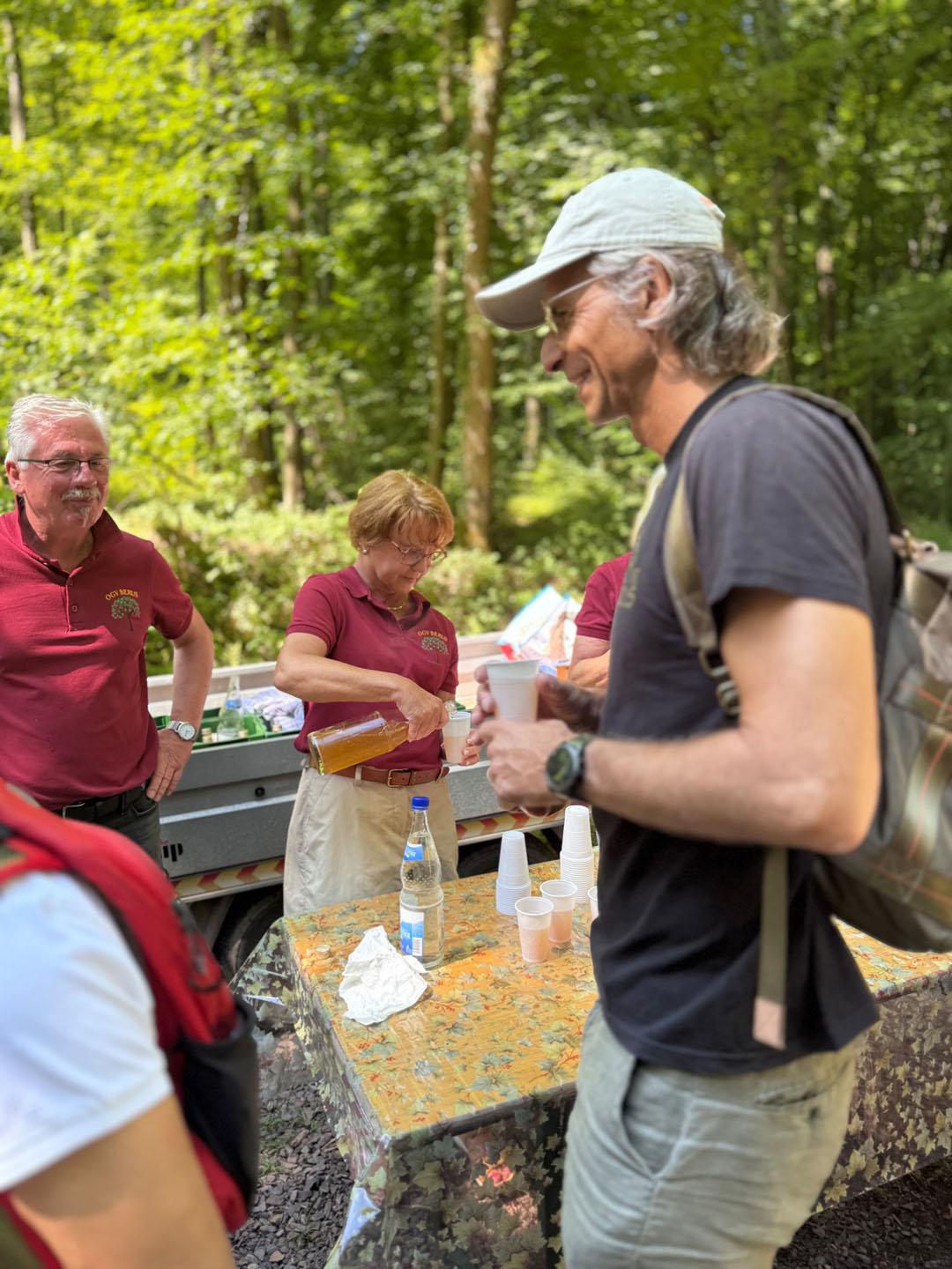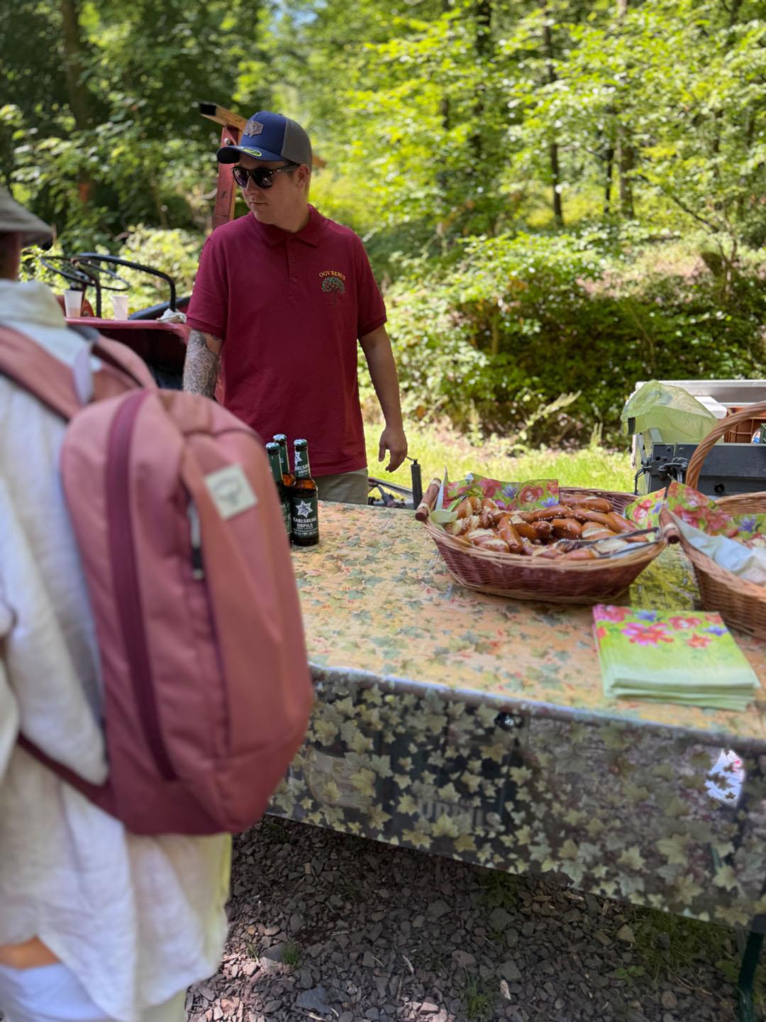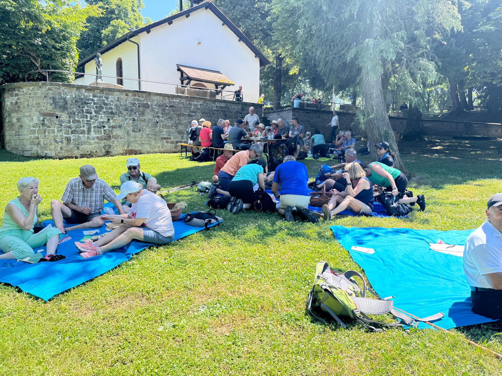 Ein kulinarischer und musikalischer Höhepunkt folgte an der St.-Oranna-Kapelle: Picknickkörbe vom Tintinger Hof, Éclairs & Croissants aus der Bäckerei in Merten. Zurück am Europadenkmal empfingen die Beruser Jäger die Gruppe mit einem Horn-Ständchen und saftigen Wildwürsten vom Grill. Mundart-Chansons von Edwin Bohlinger und Johannes Berrar rundeten die Veranstaltung mit einem musikalischen Genussmoment ab.