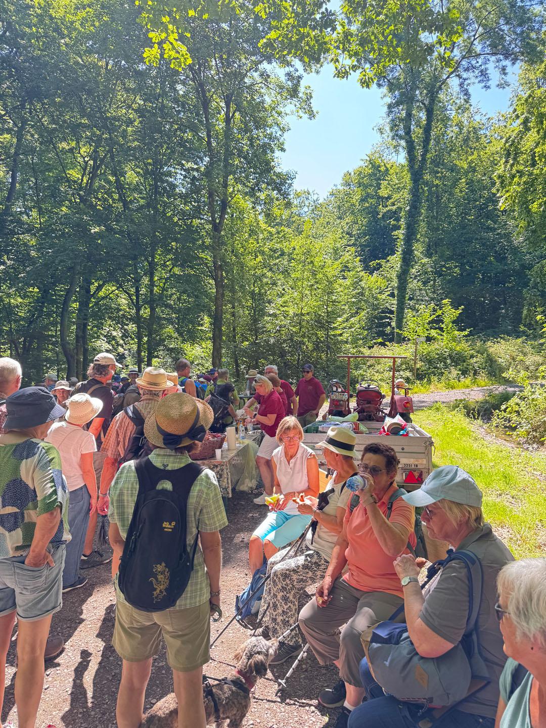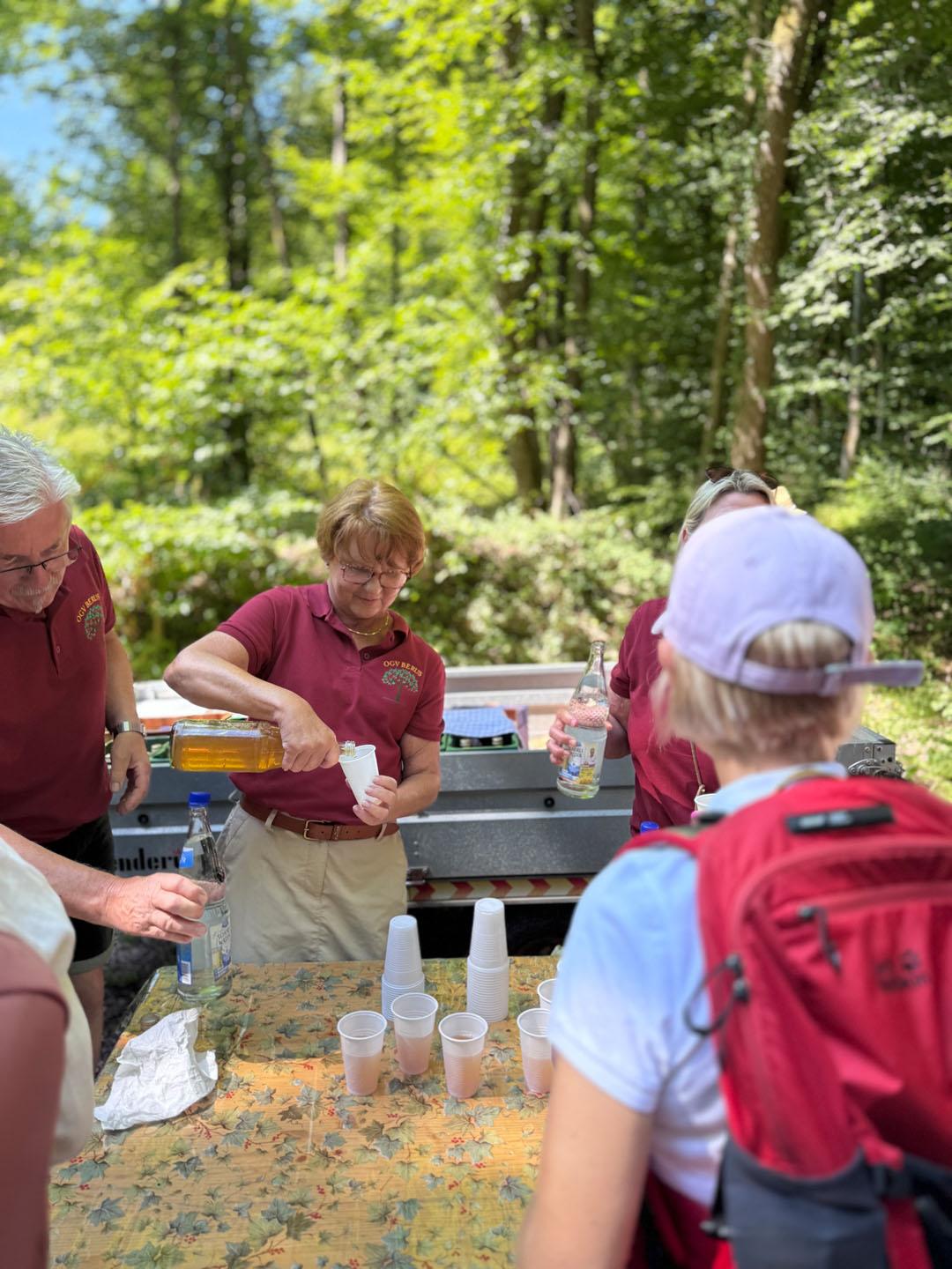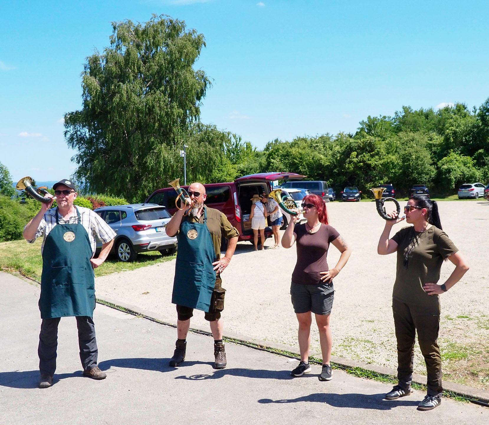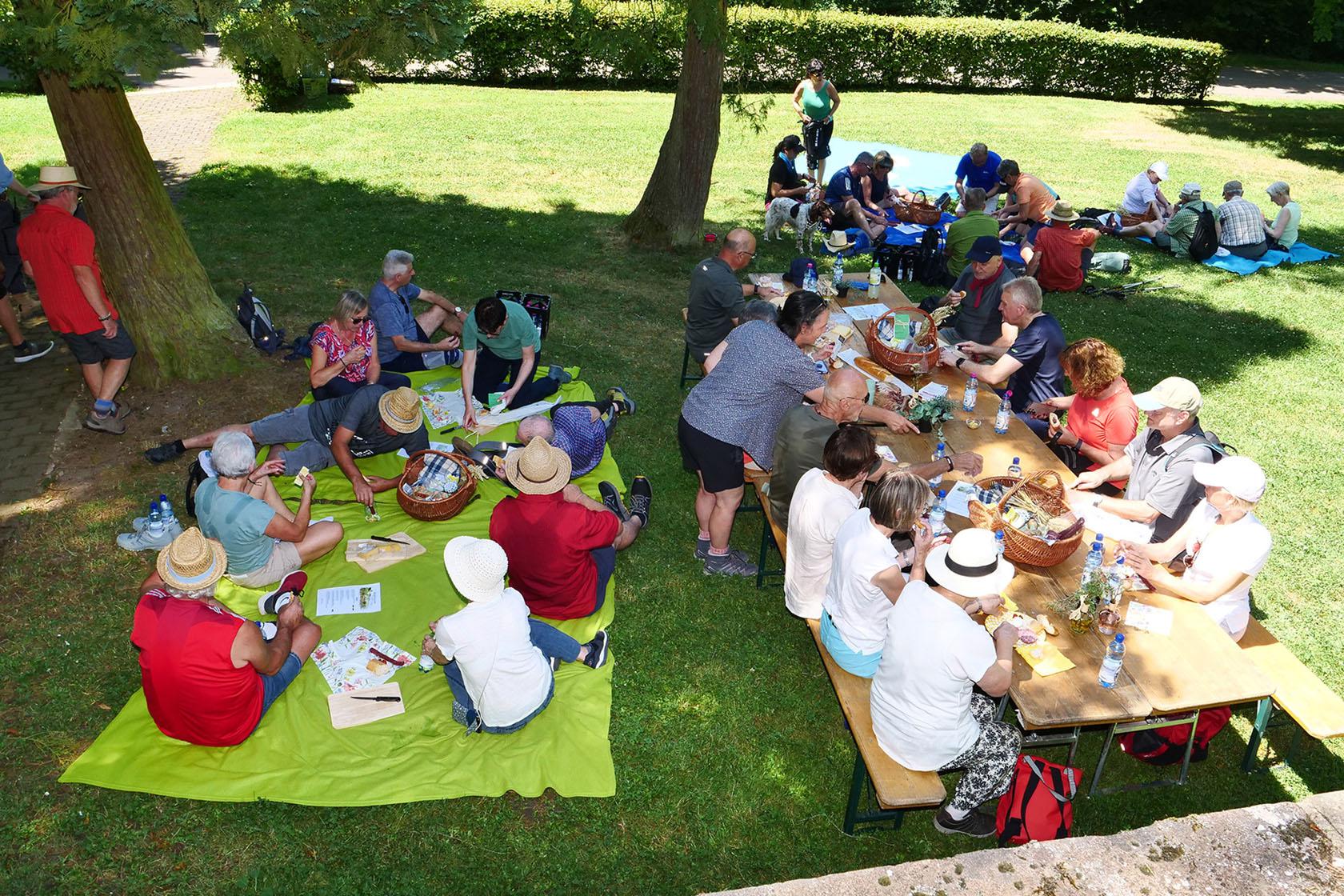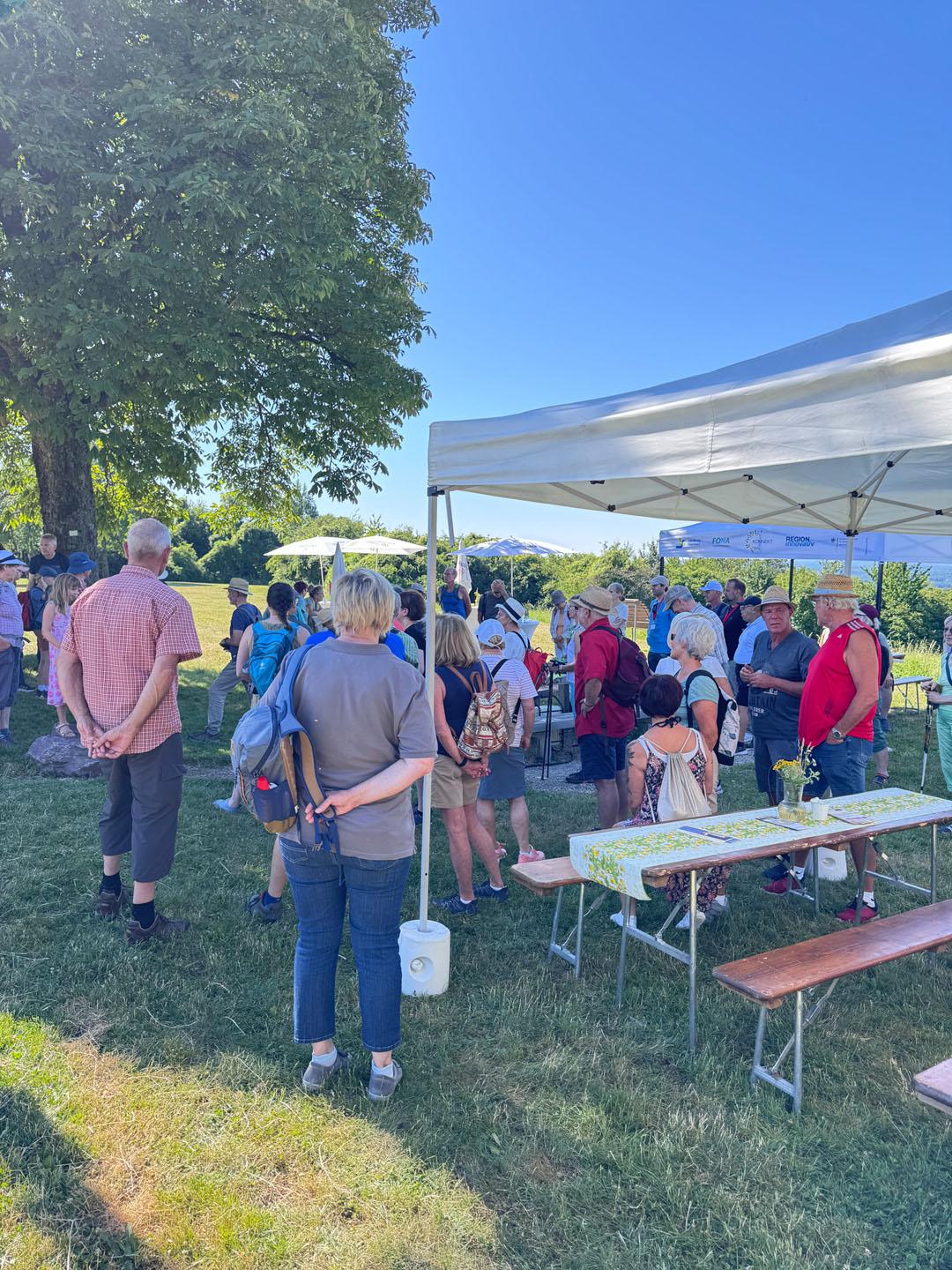 Ein kulinarischer und musikalischer Höhepunkt folgte an der St.-Oranna-Kapelle: Picknickkörbe vom Tintinger Hof, Éclairs & Croissants aus der Bäckerei in Merten. Zurück am Europadenkmal empfingen die Beruser Jäger die Gruppe mit einem Horn-Ständchen und saftigen Wildwürsten vom Grill. Mundart-Chansons von Edwin Bohlinger und Johannes Berrar rundeten die Veranstaltung mit einem musikalischen Genussmoment ab.
