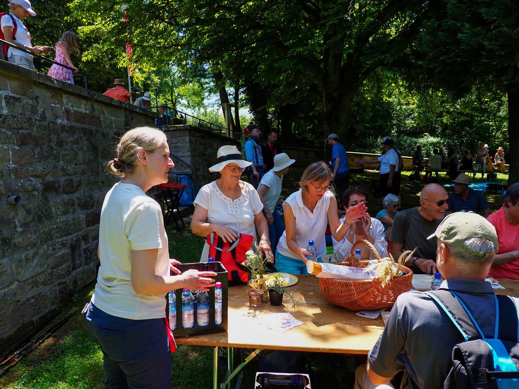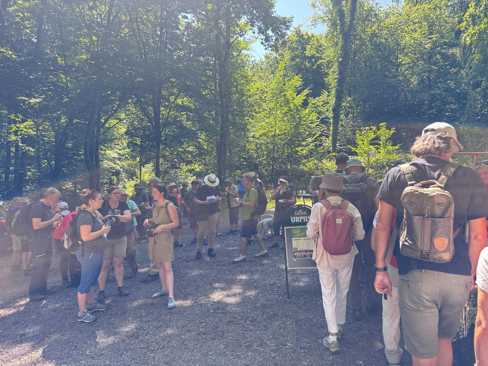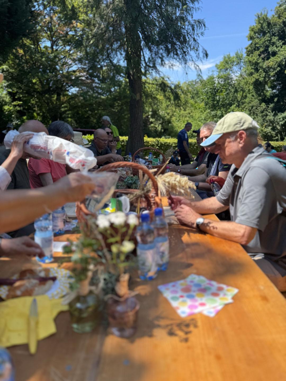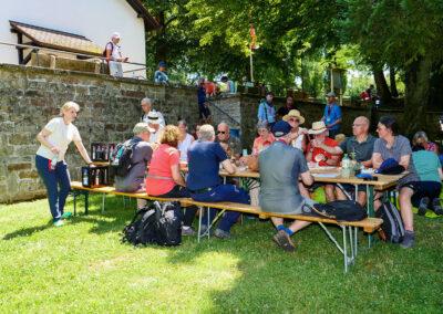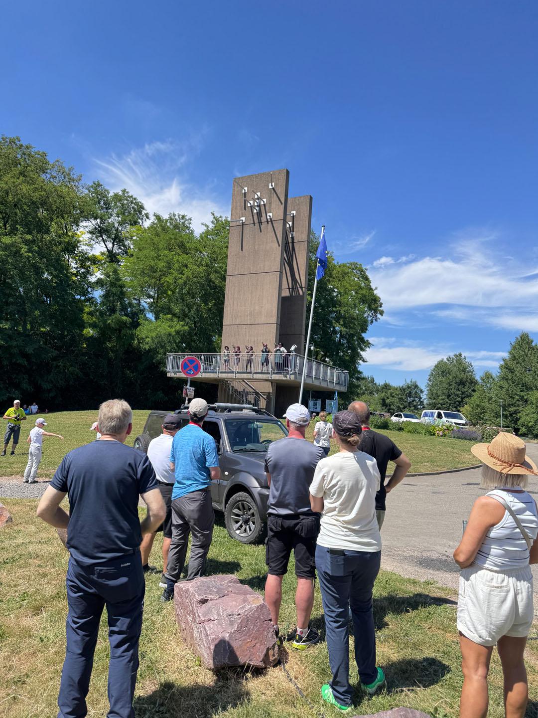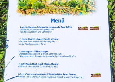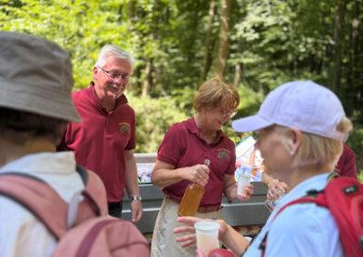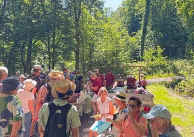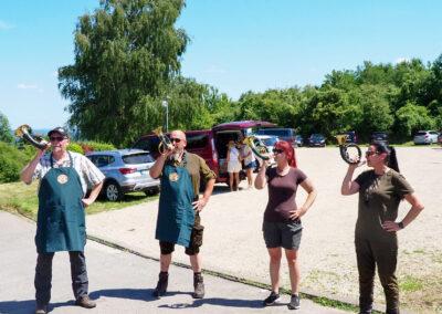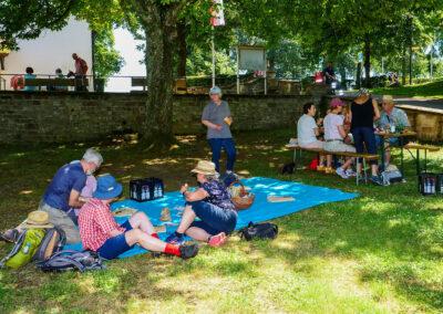 Ein kulinarischer und musikalischer Höhepunkt folgte an der St.-Oranna-Kapelle: Picknickkörbe vom Tintinger Hof, Éclairs & Croissants aus der Bäckerei in Merten. Zurück am Europadenkmal empfingen die Beruser Jäger die Gruppe mit einem Horn-Ständchen und saftigen Wildwürsten vom Grill. Mundart-Chansons von Edwin Bohlinger und Johannes Berrar rundeten die Veranstaltung mit einem musikalischen Genussmoment ab.