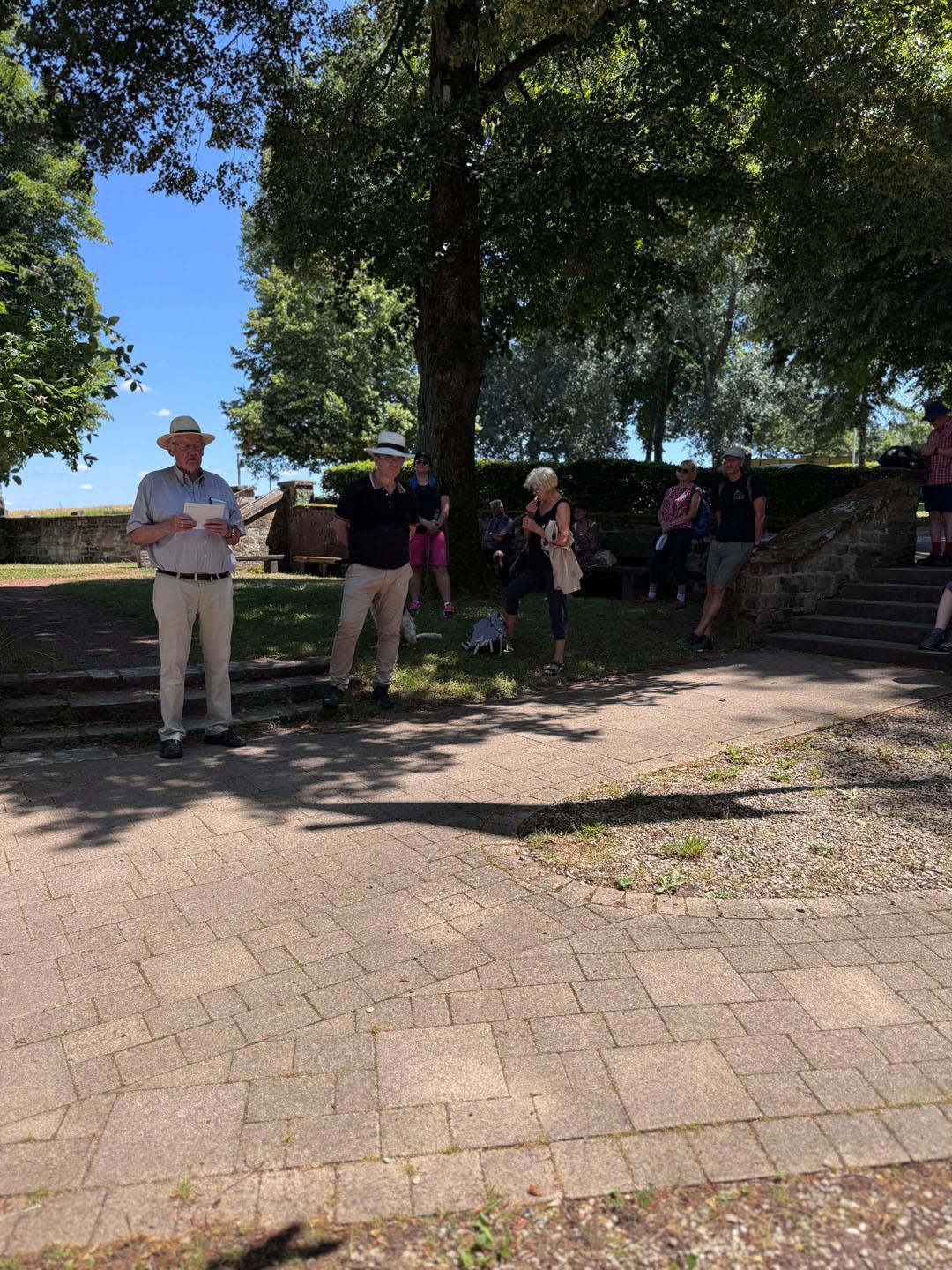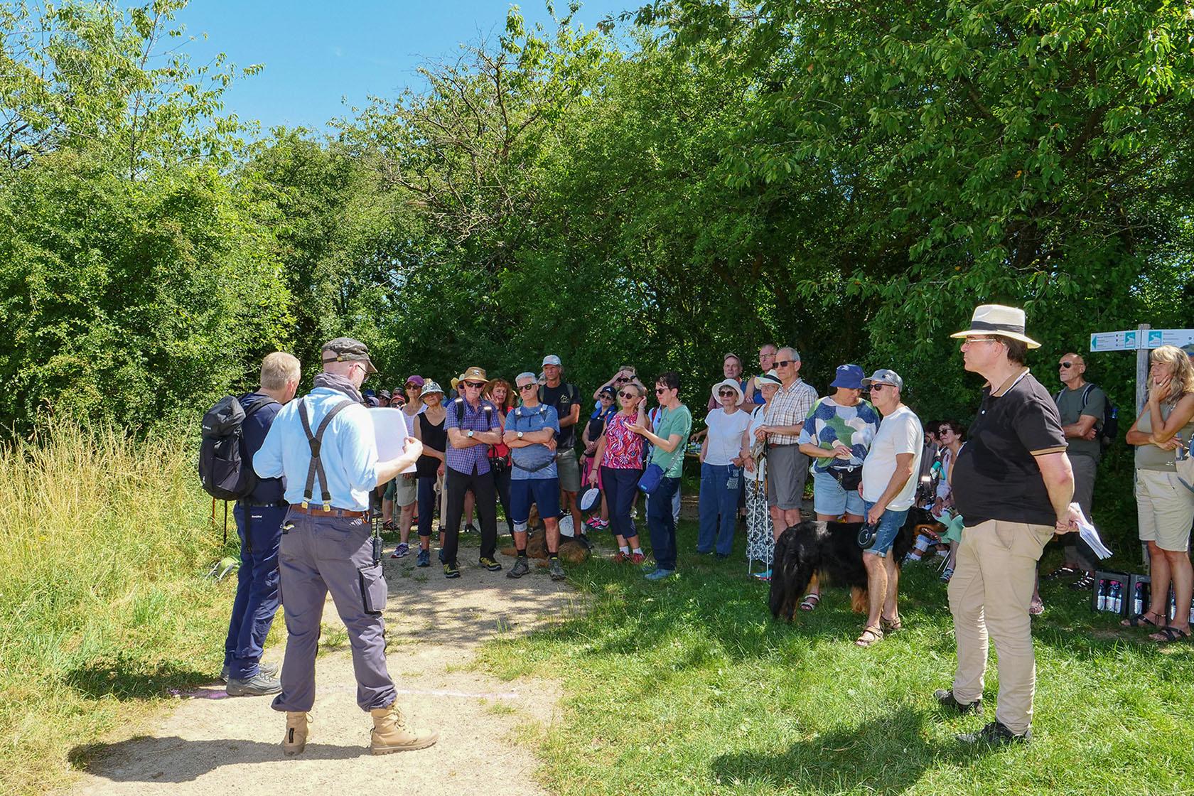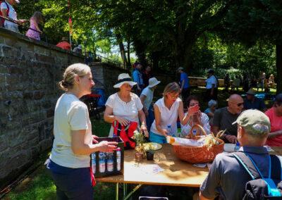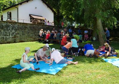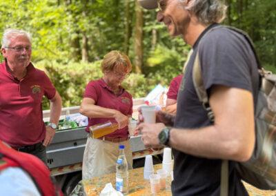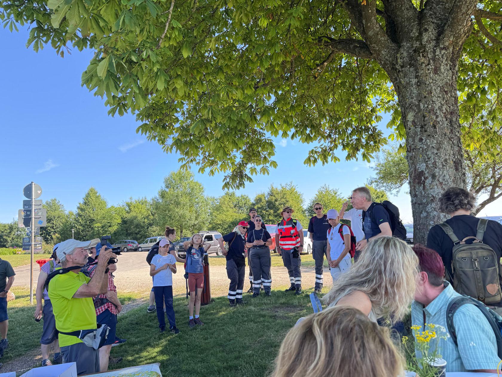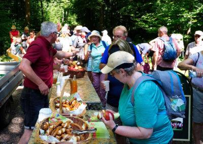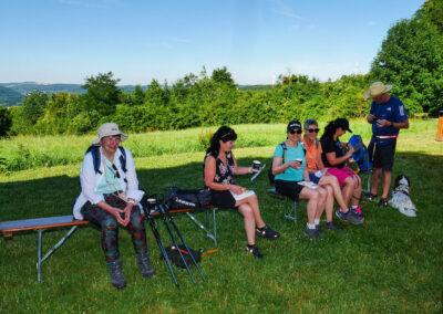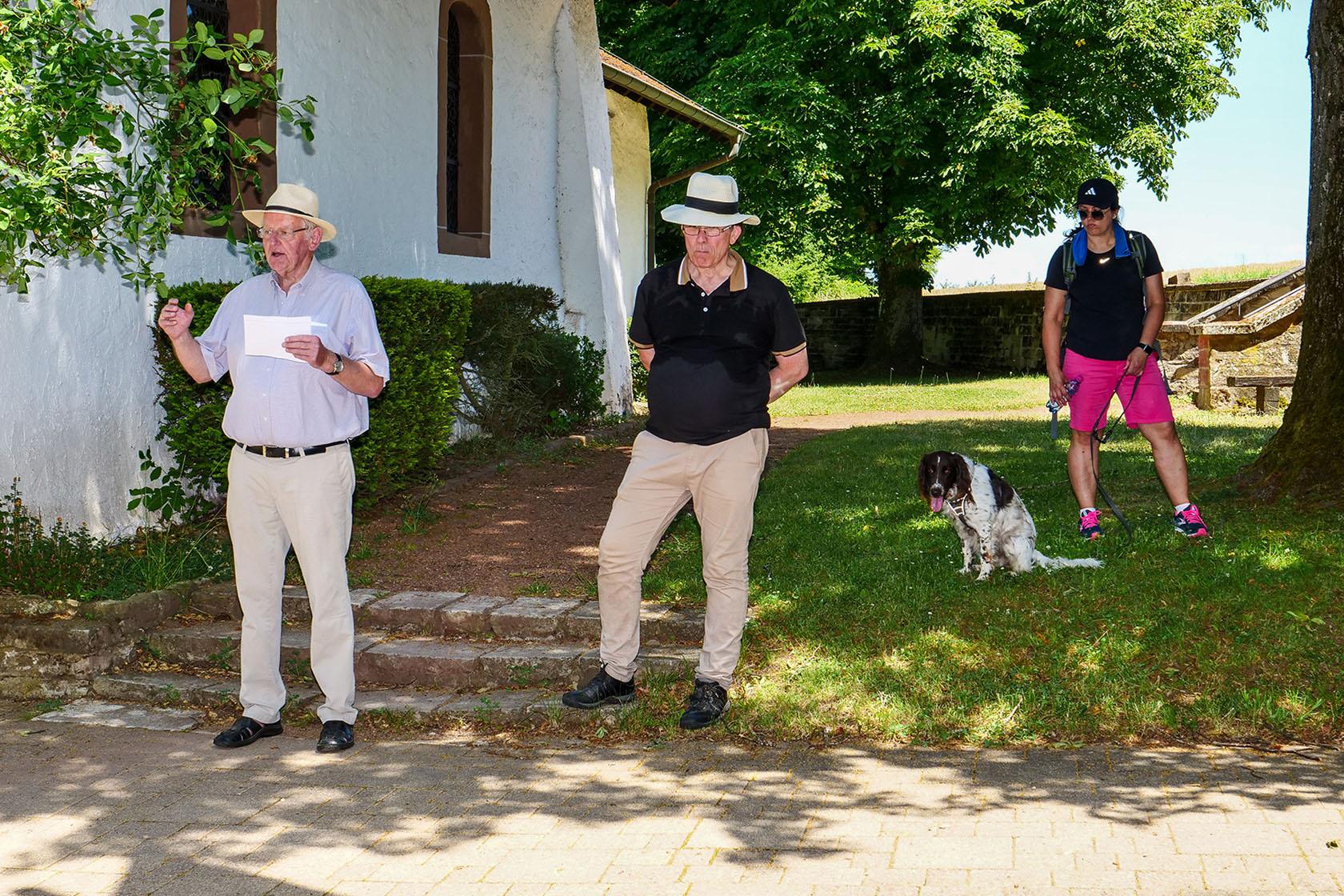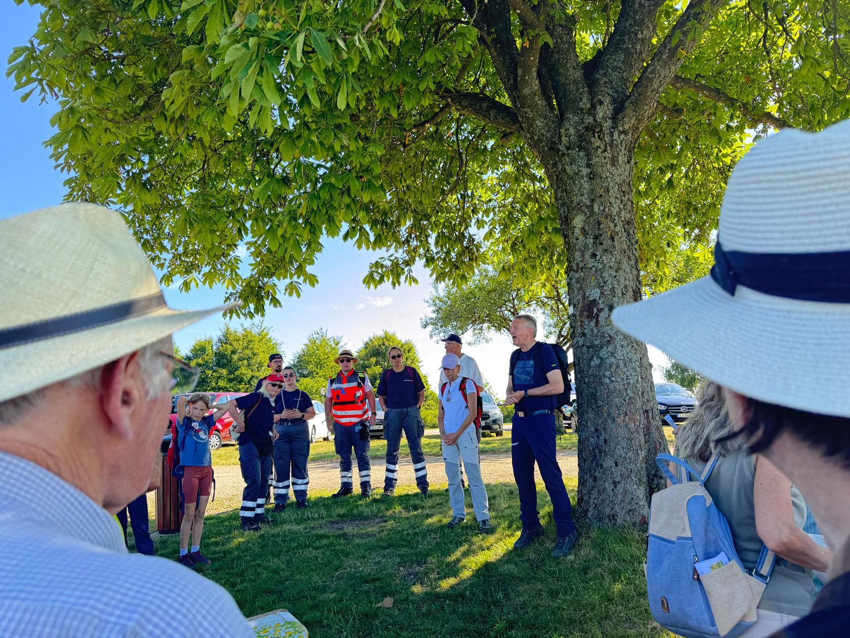 Ein kulinarischer und musikalischer Höhepunkt folgte an der St.-Oranna-Kapelle: Picknickkörbe vom Tintinger Hof, Éclairs & Croissants aus der Bäckerei in Merten. Zurück am Europadenkmal empfingen die Beruser Jäger die Gruppe mit einem Horn-Ständchen und saftigen Wildwürsten vom Grill. Mundart-Chansons von Edwin Bohlinger und Johannes Berrar rundeten die Veranstaltung mit einem musikalischen Genussmoment ab.