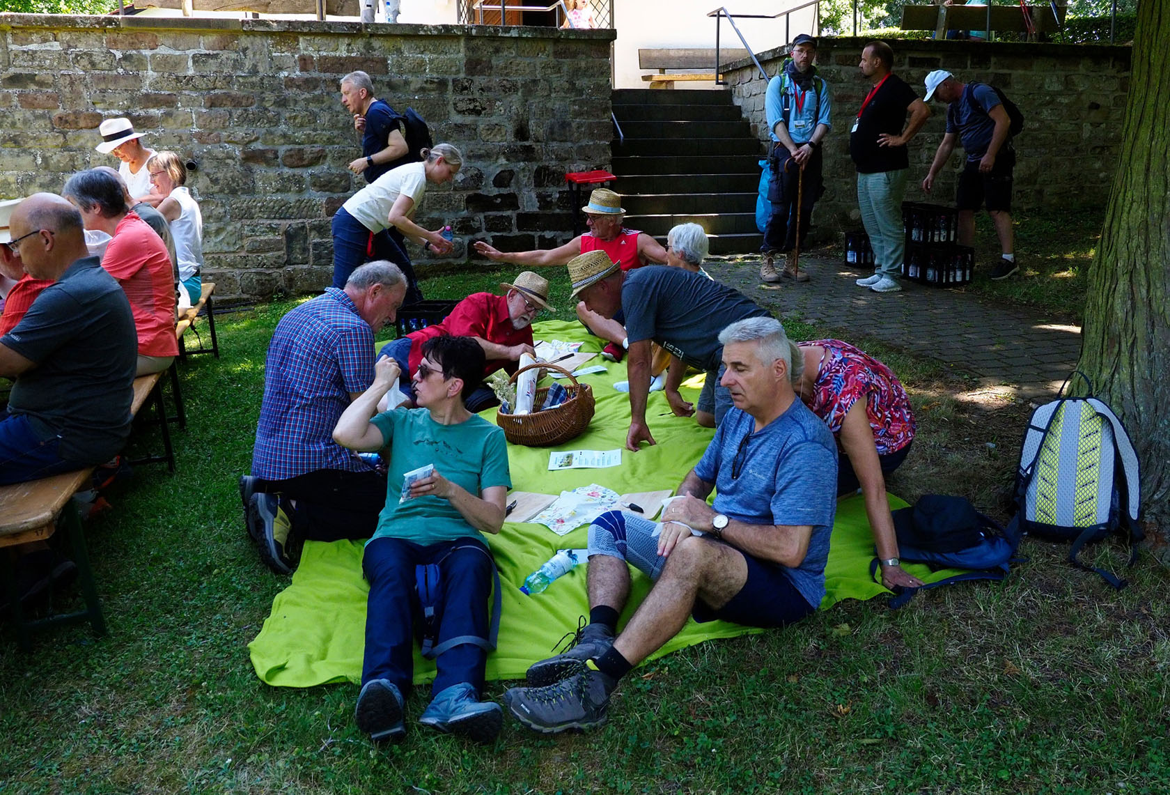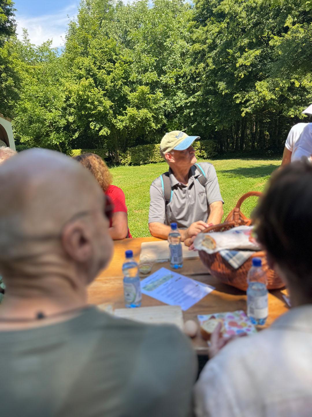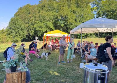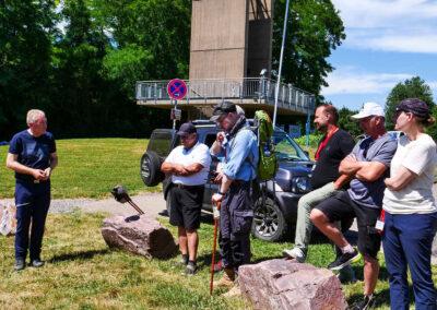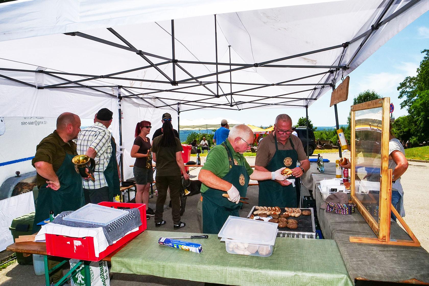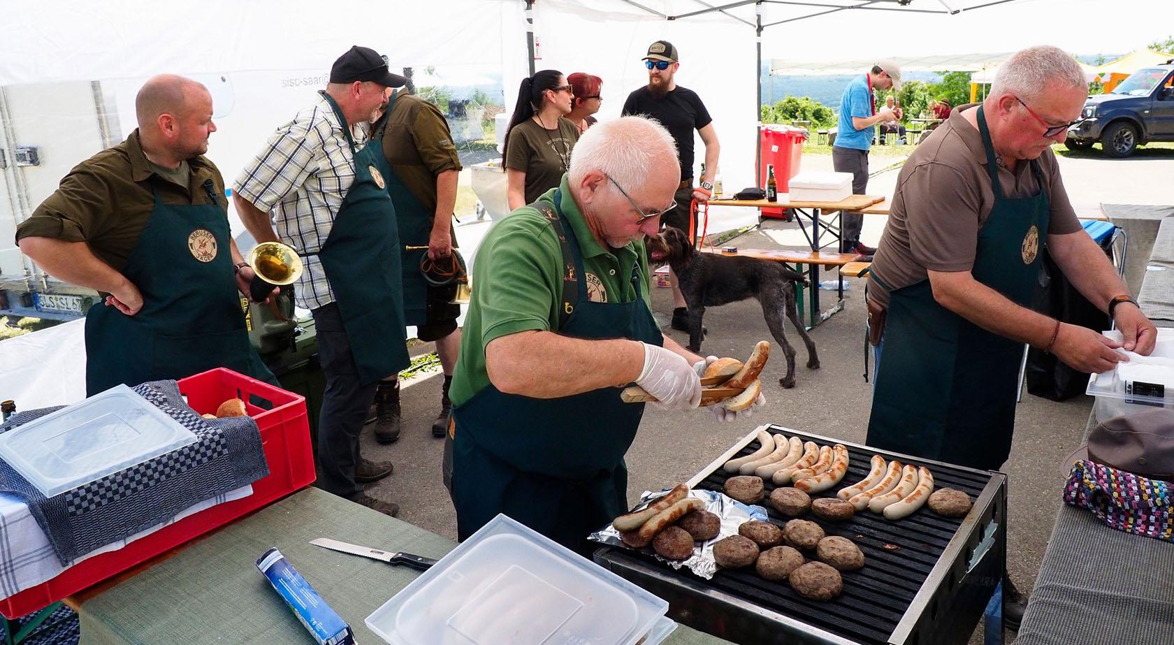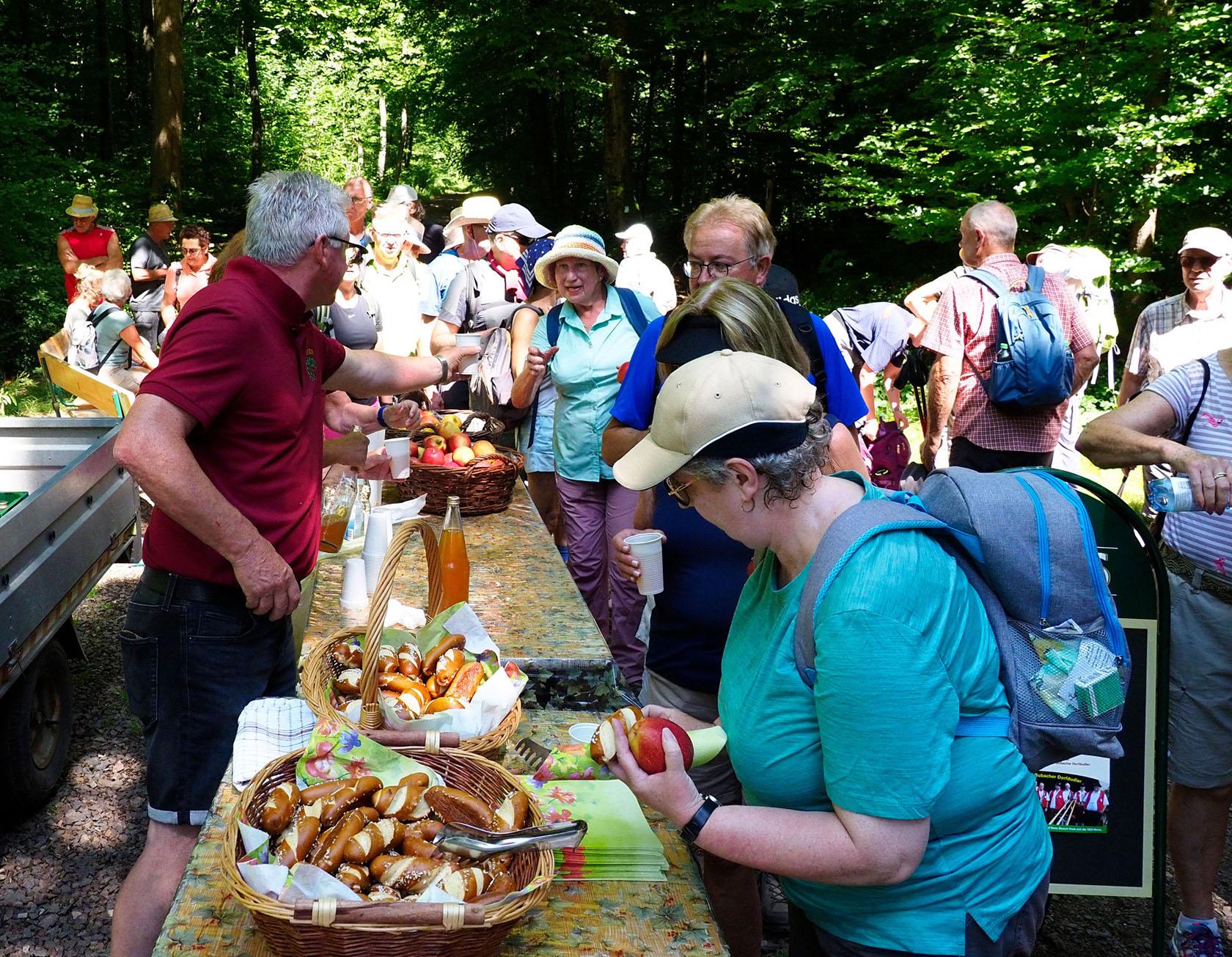 Ein kulinarischer und musikalischer Höhepunkt folgte an der St.-Oranna-Kapelle: Picknickkörbe vom Tintinger Hof, Éclairs & Croissants aus der Bäckerei in Merten. Zurück am Europadenkmal empfingen die Beruser Jäger die Gruppe mit einem Horn-Ständchen und saftigen Wildwürsten vom Grill. Mundart-Chansons von Edwin Bohlinger und Johannes Berrar rundeten die Veranstaltung mit einem musikalischen Genussmoment ab.