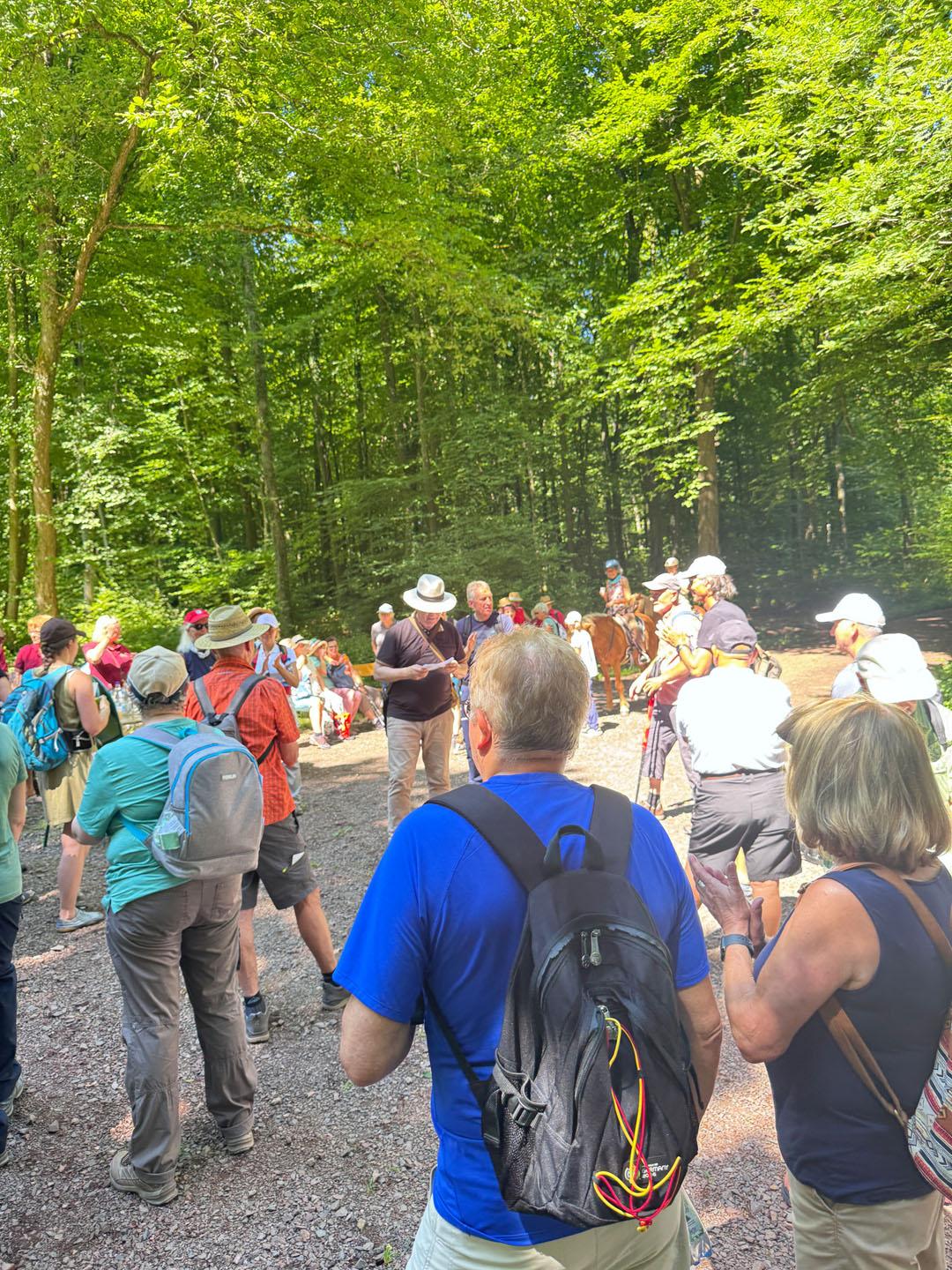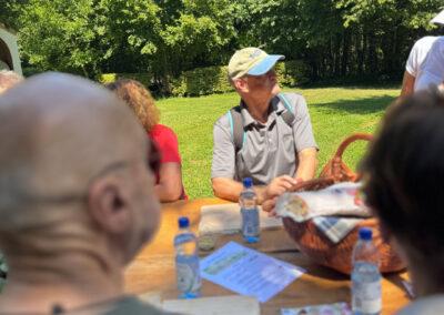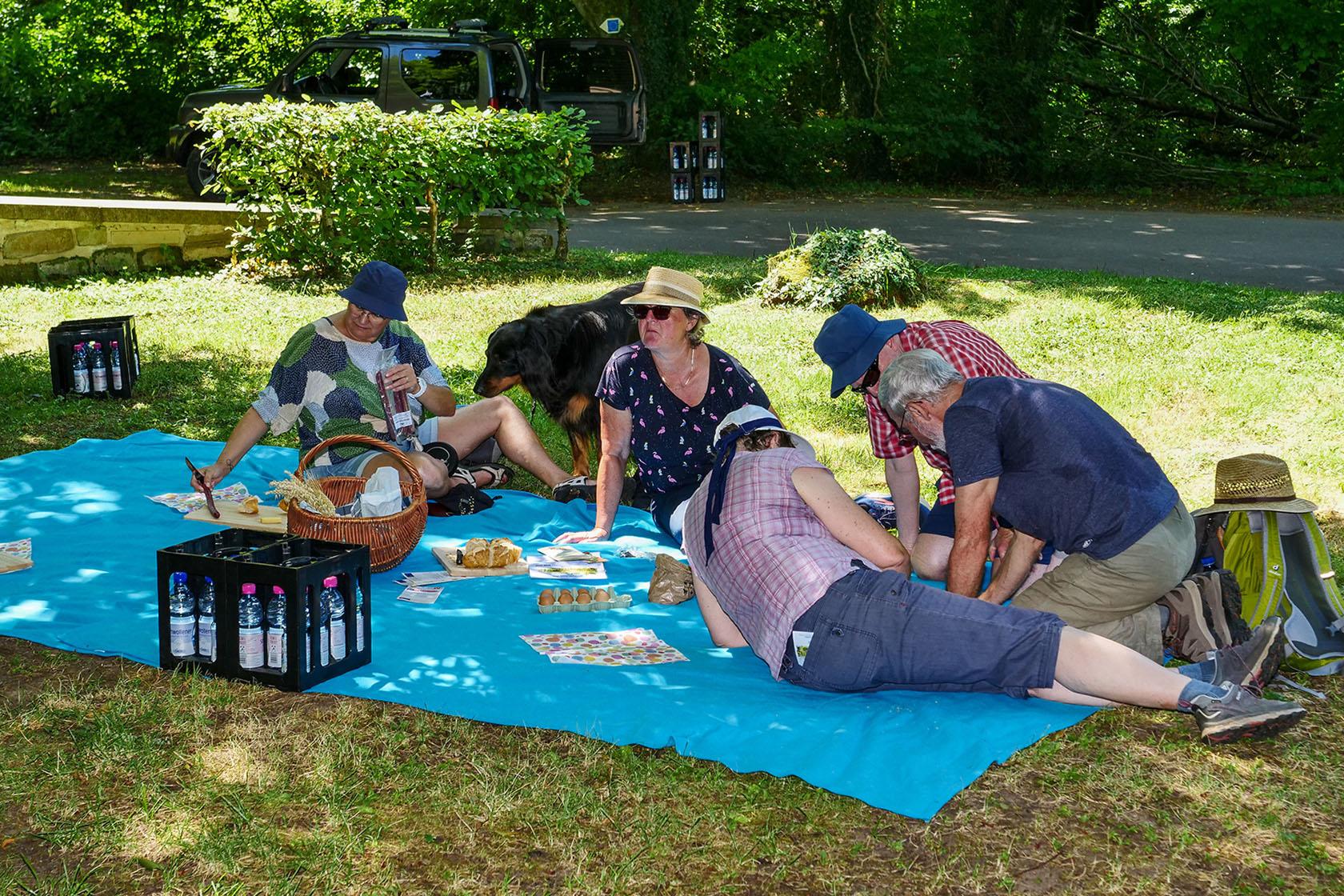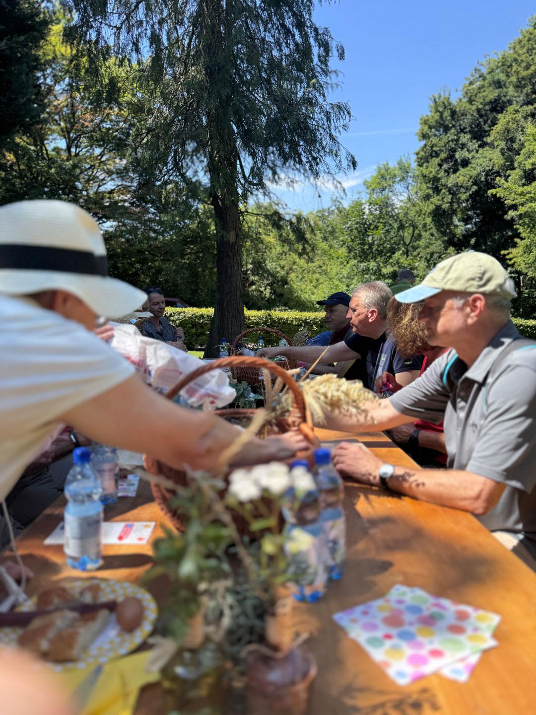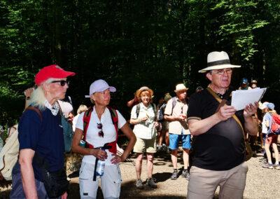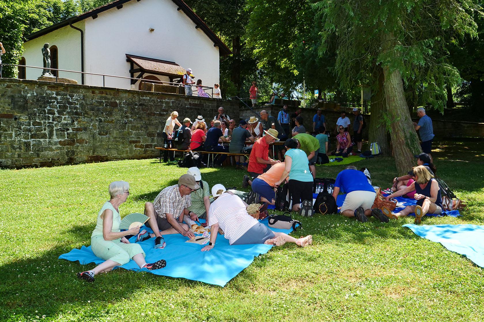 Ein kulinarischer und musikalischer Höhepunkt folgte an der St.-Oranna-Kapelle: Picknickkörbe vom Tintinger Hof, Éclairs & Croissants aus der Bäckerei in Merten. Zurück am Europadenkmal empfingen die Beruser Jäger die Gruppe mit einem Horn-Ständchen und saftigen Wildwürsten vom Grill. Mundart-Chansons von Edwin Bohlinger und Johannes Berrar rundeten die Veranstaltung mit einem musikalischen Genussmoment ab.