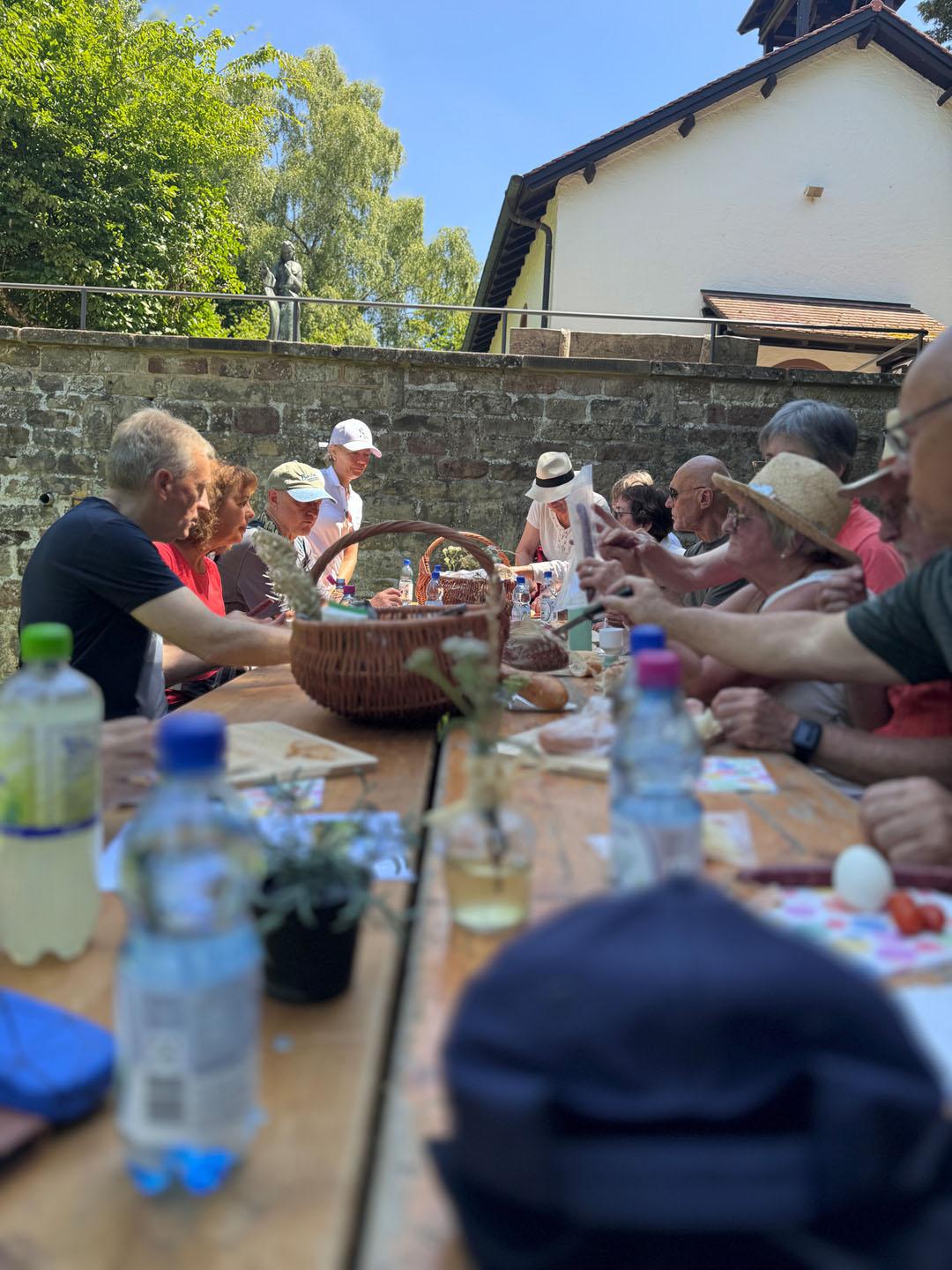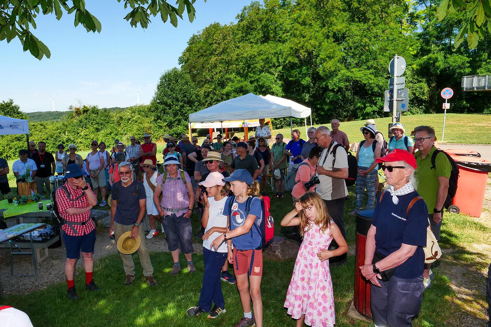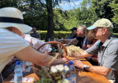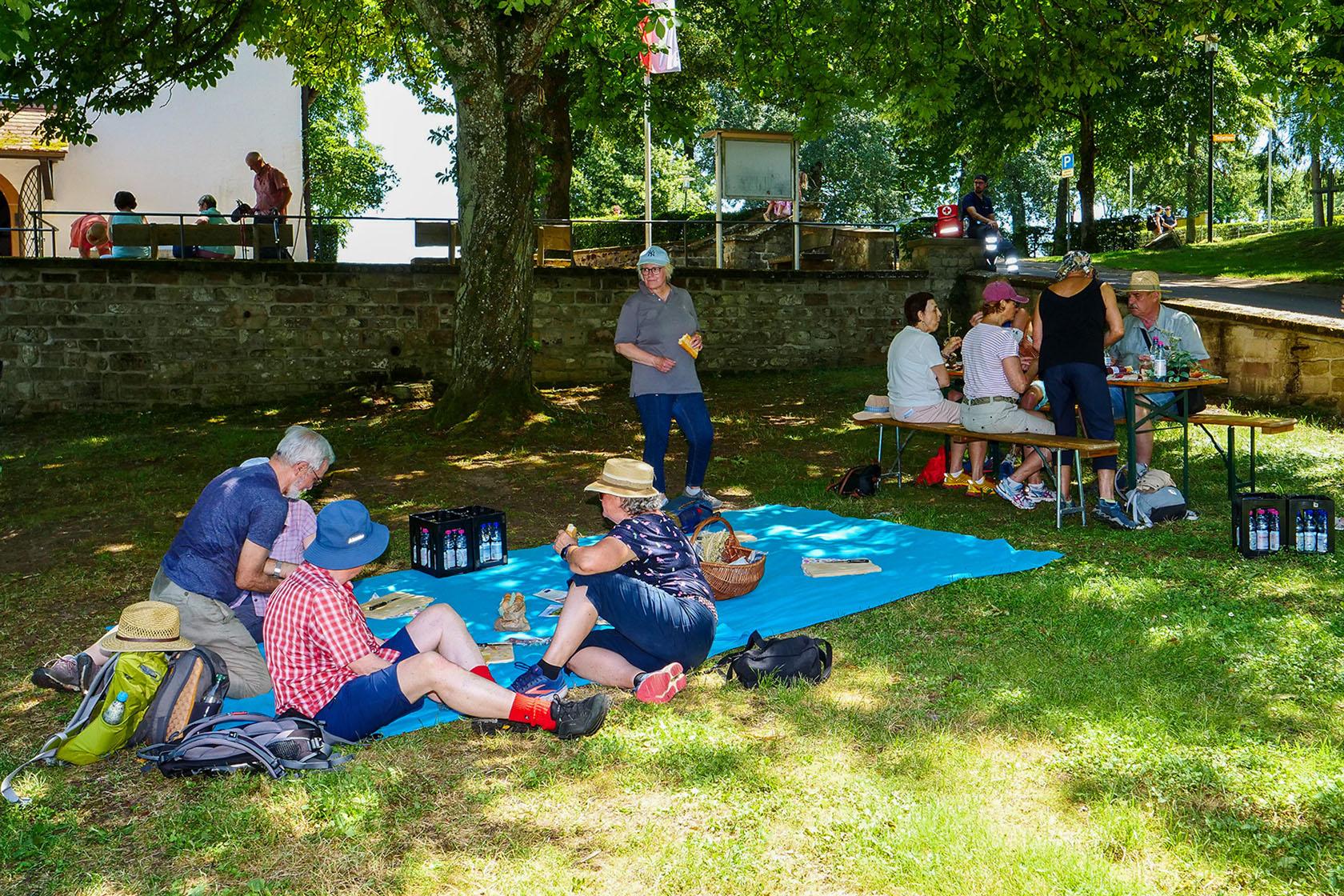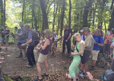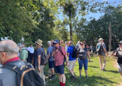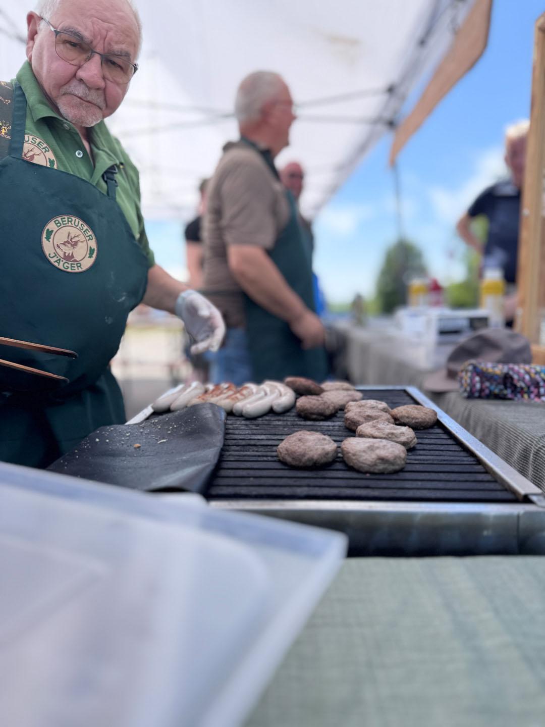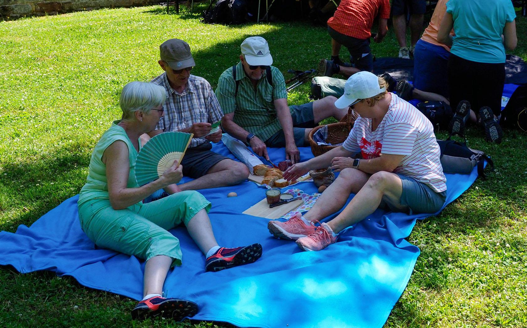 Ein kulinarischer und musikalischer Höhepunkt folgte an der St.-Oranna-Kapelle: Picknickkörbe vom Tintinger Hof, Éclairs & Croissants aus der Bäckerei in Merten. Zurück am Europadenkmal empfingen die Beruser Jäger die Gruppe mit einem Horn-Ständchen und saftigen Wildwürsten vom Grill. Mundart-Chansons von Edwin Bohlinger und Johannes Berrar rundeten die Veranstaltung mit einem musikalischen Genussmoment ab.